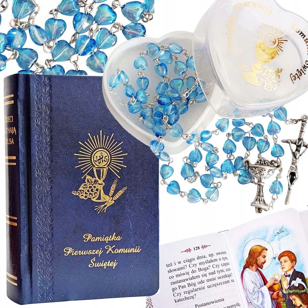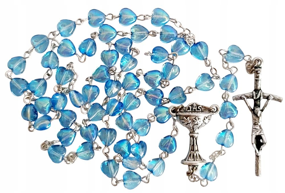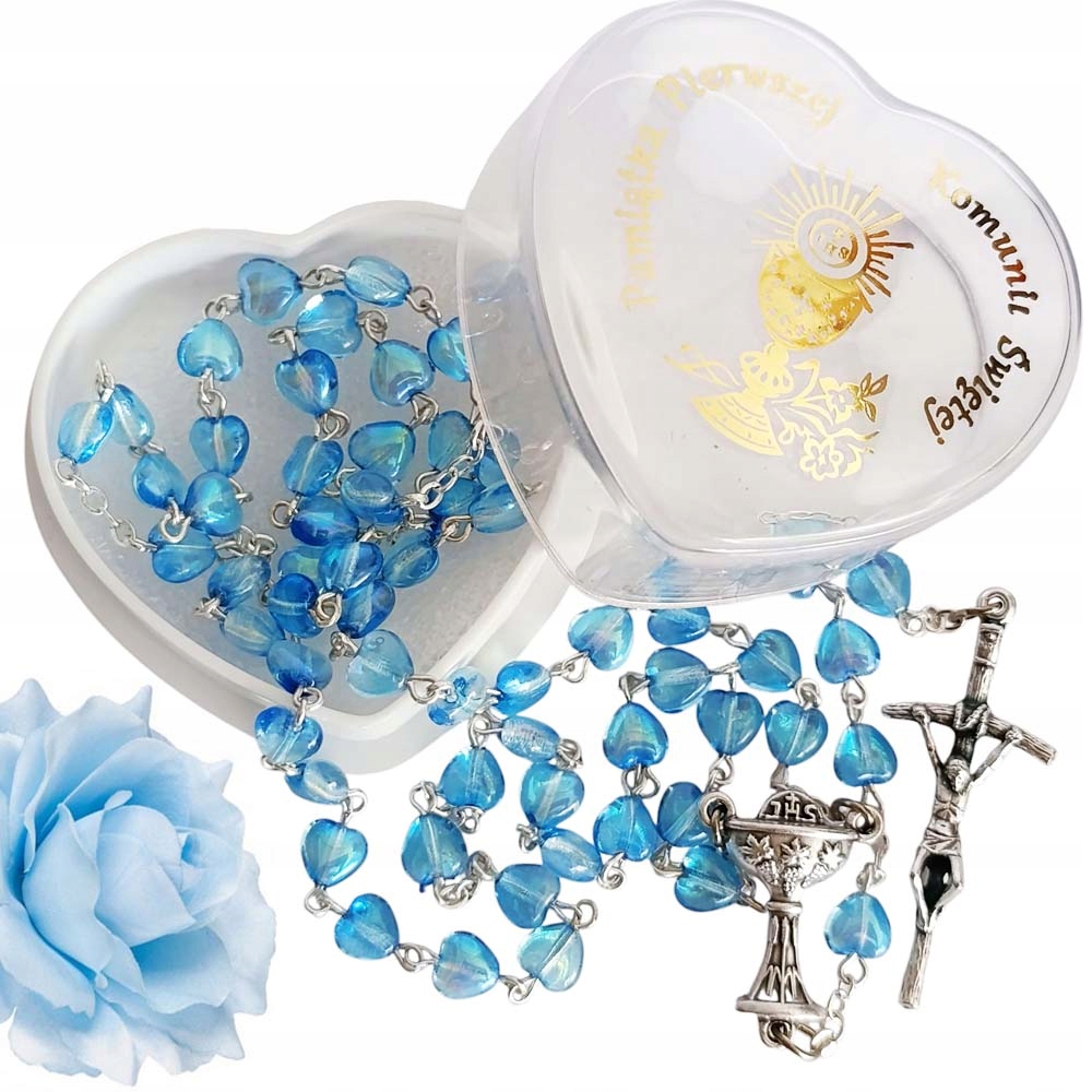 Красивое причастие Розарий - Голубые хрустальные сердца - в коробке с сердцем + молитвенную книгу с замечательными фотографиями внутри - h1> Итальянские элементы розария: чашка IHS, крест и цепь h1>