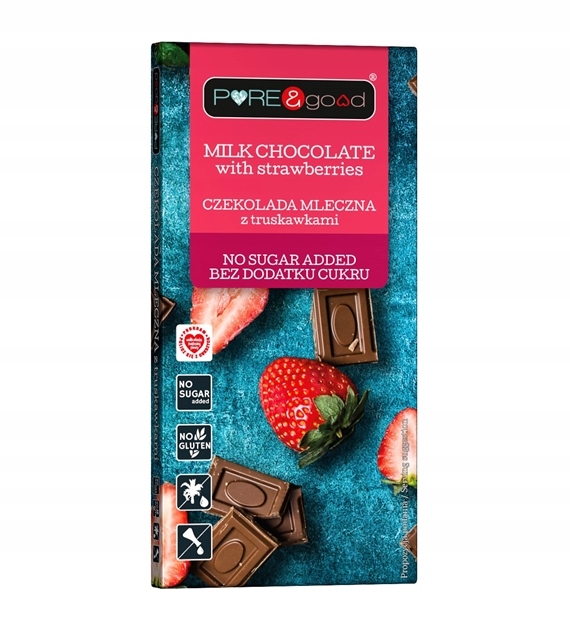 Изысканный испанский молочный шоколад Pure&Good с клубникой, без добавления сахара, глютена и пальмового масла. Подходит для диабетиков. Содержит подсластители.