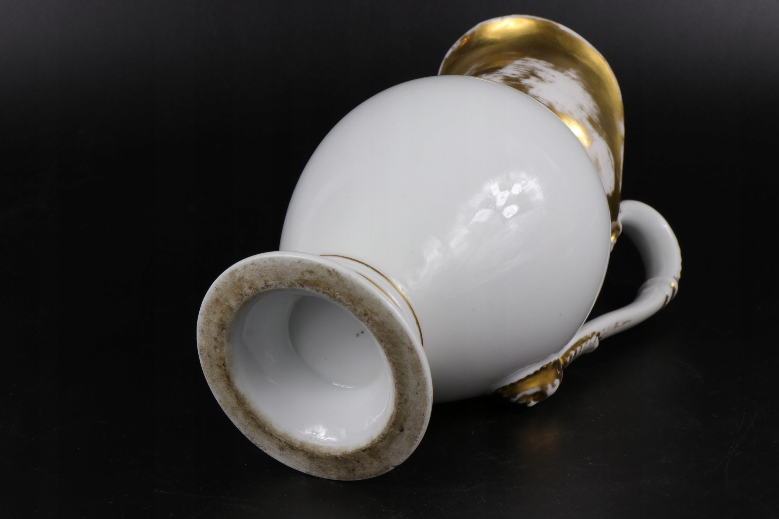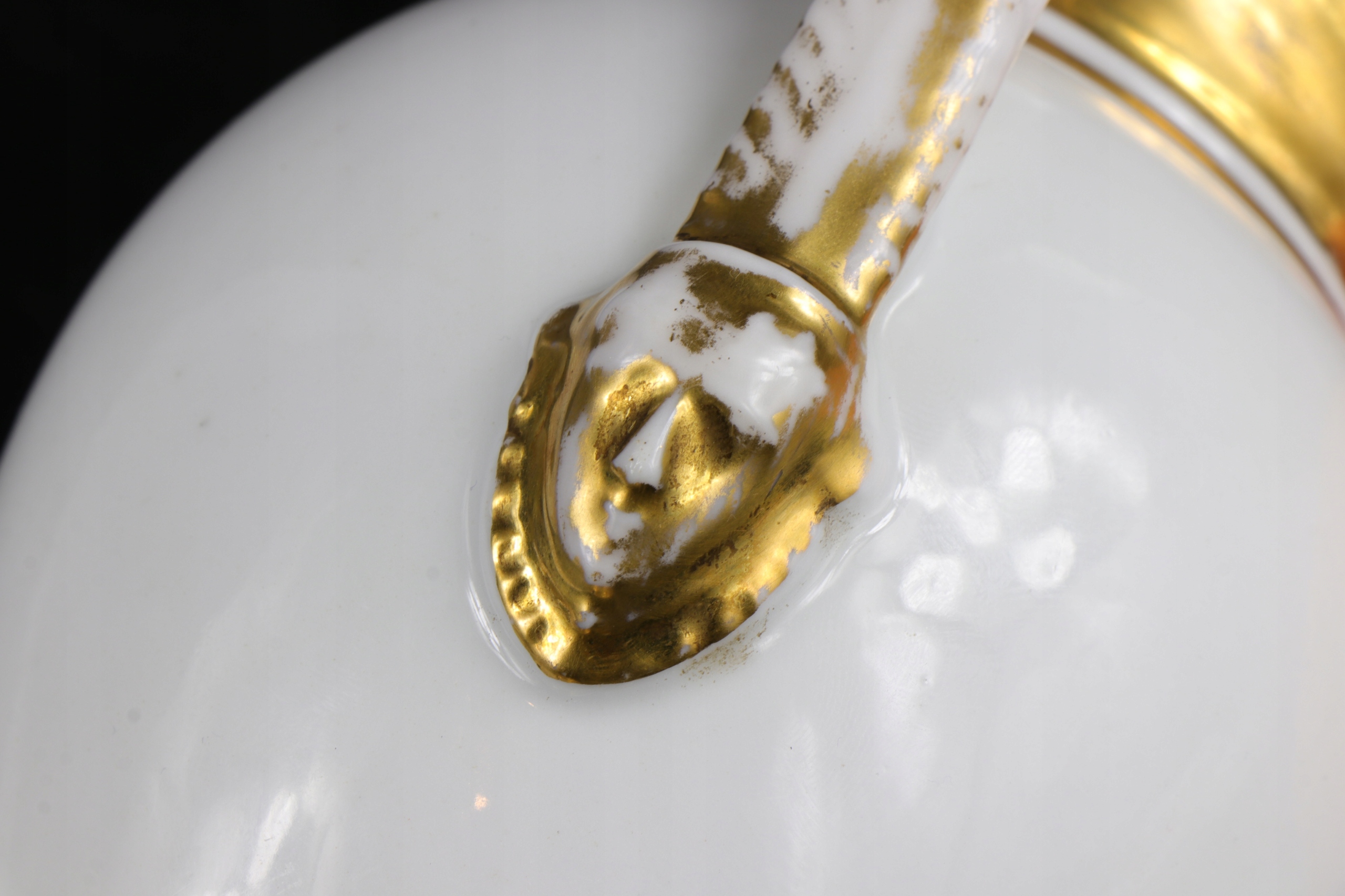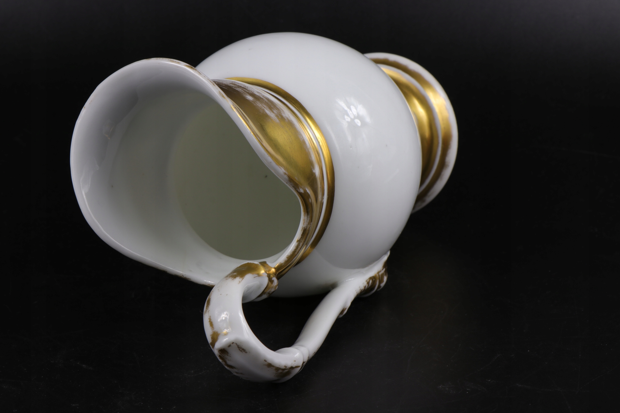 Интересный, очень большой фарфоровый молочник или кувшин в стиле ампир из греческой вазы. Ручка сосуда внизу заканчивается барельефом головы. Богато позолоченный фарфор. На дне сосуда отпечаток буквы N.