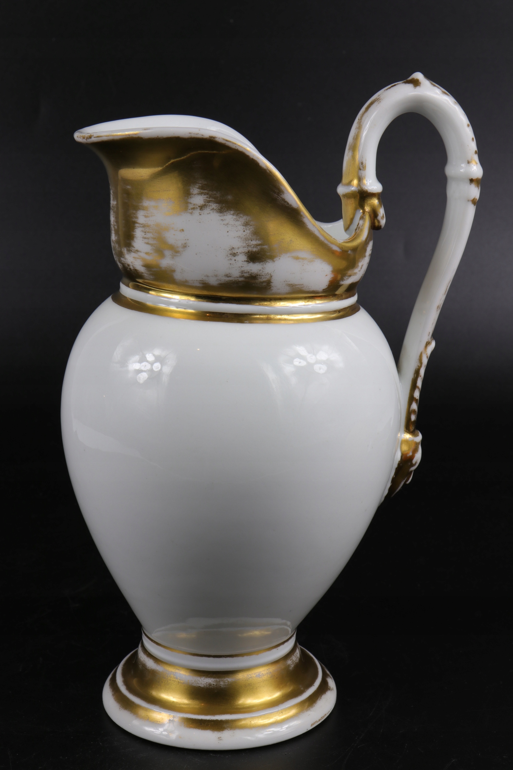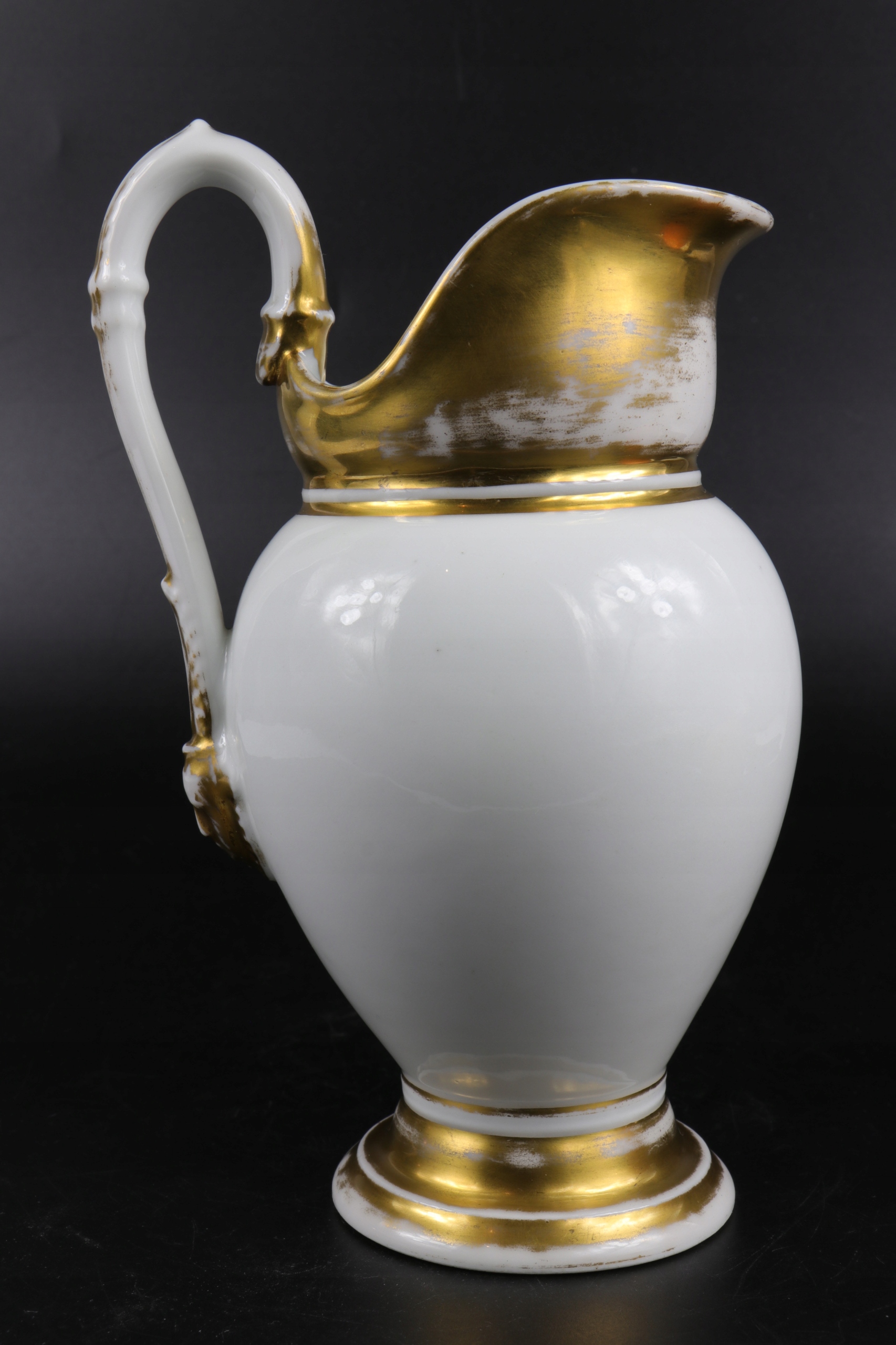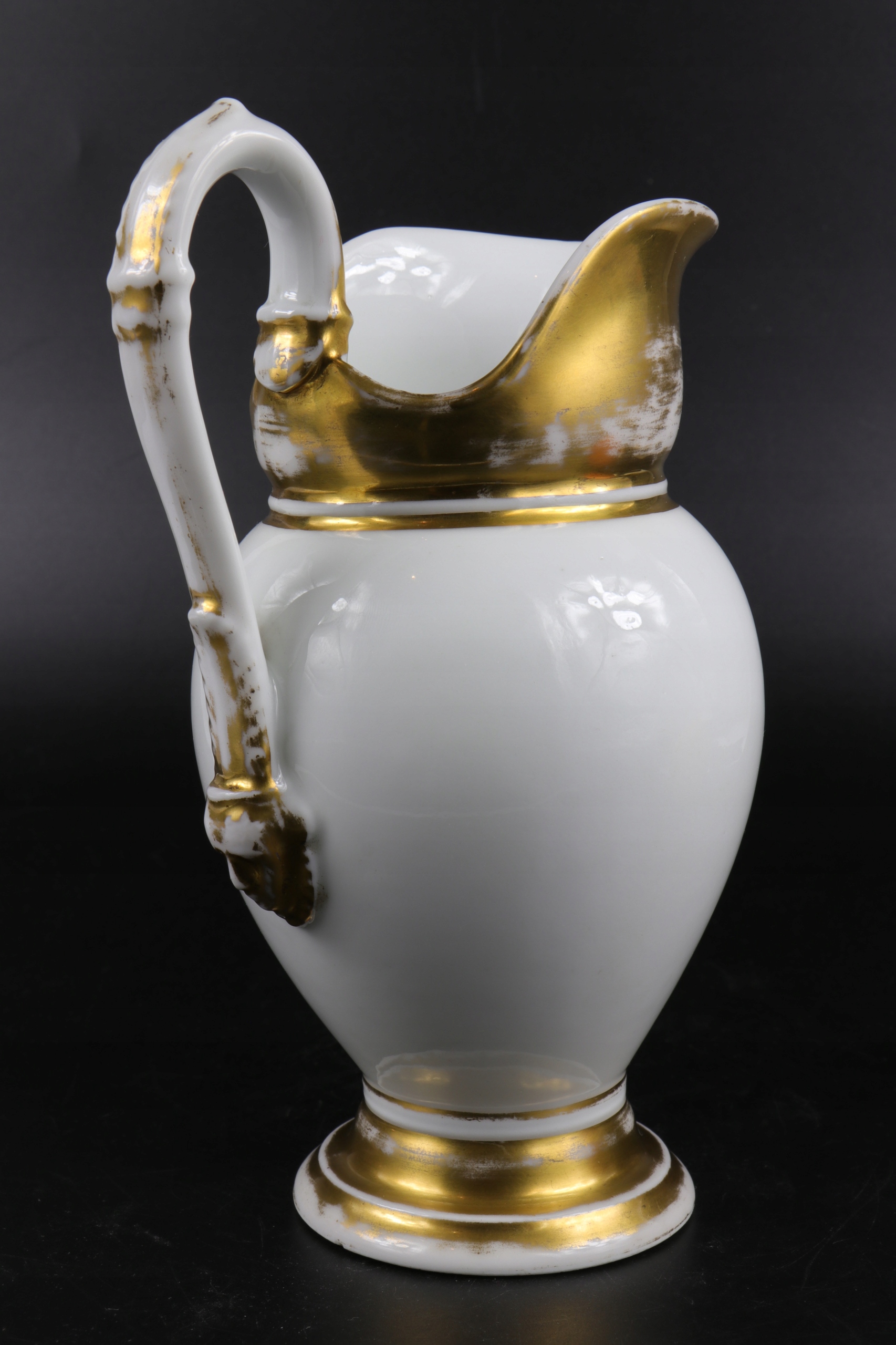 Интересный, очень большой фарфоровый молочник или кувшин в стиле ампир из греческой вазы. Ручка сосуда внизу заканчивается барельефом головы. Богато позолоченный фарфор. На дне сосуда отпечаток буквы N.