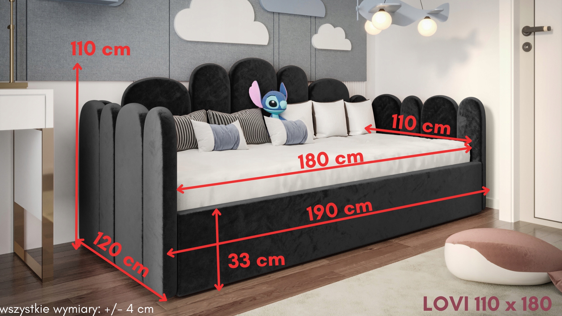 lovi - очаровательная, обитая кровать, созданная для маленьких и более крупных мечтателей! � Его округлые изголовья и боковые стороны напоминают мягкие облака, создавая сказочную атмосферу и уютную атмосферу в детской и молодежной комнате. � Бархатная обивка добавляет элегантность, а мягкая начинка обеспечивает комфорт и безопасность.