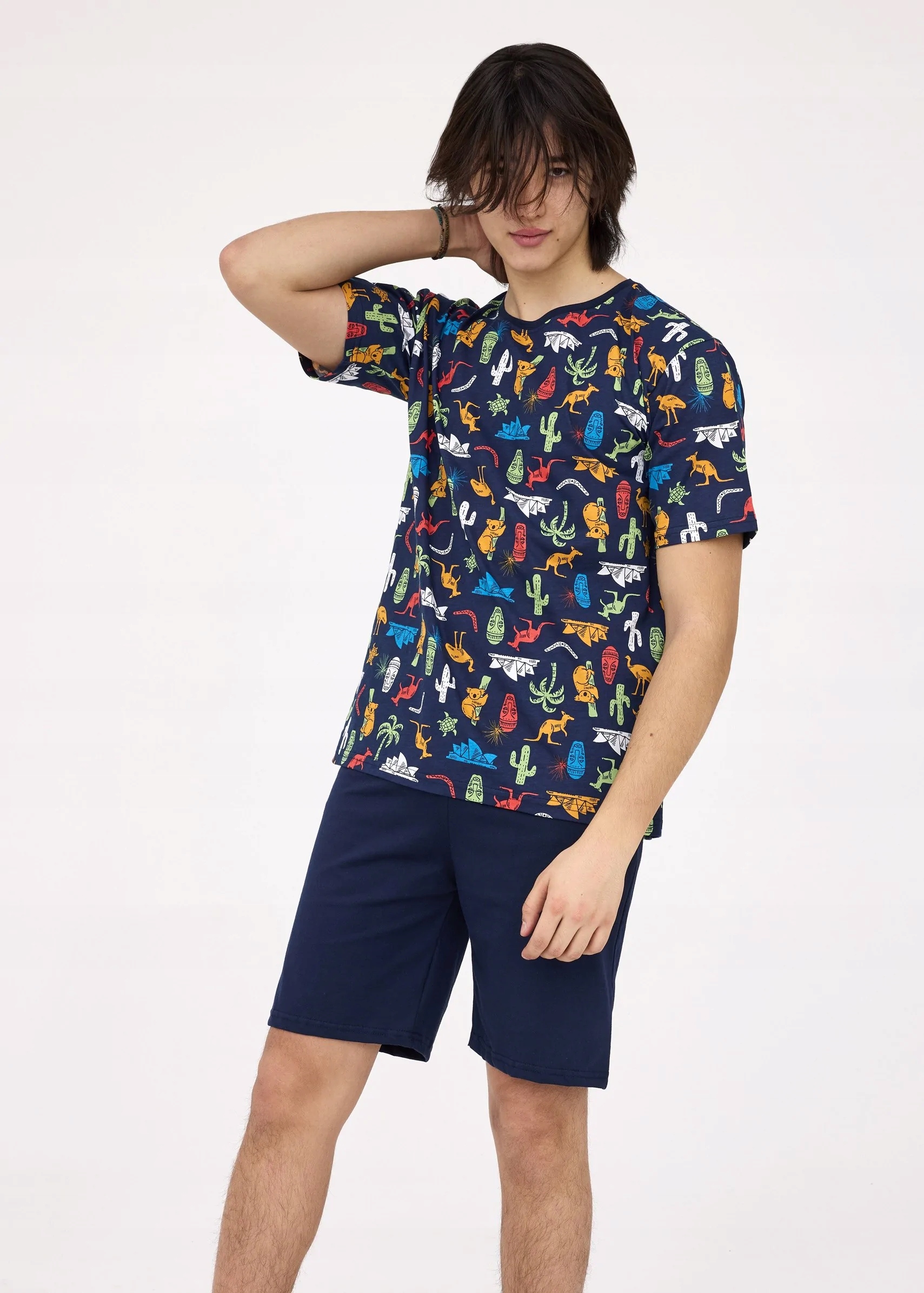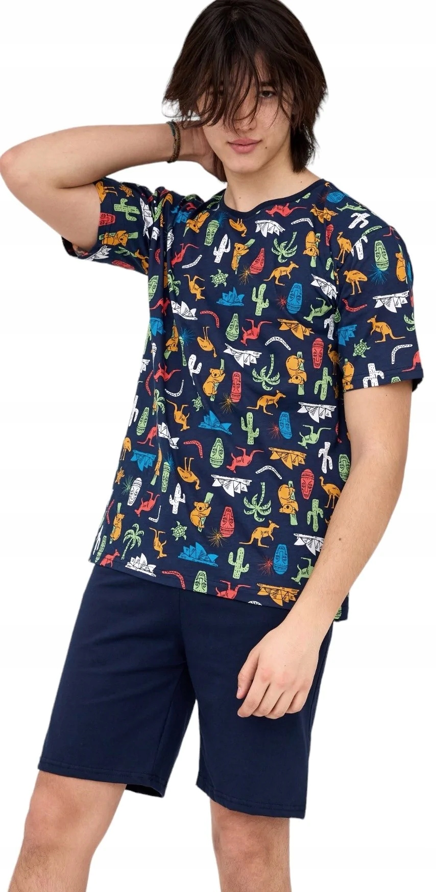 Молодежные пижамы для мальчиков от польского производителя, бренд CORNETTE. Изготовлен из здорового, приятного к телу хлопка. Обеспечивает максимальный комфорт во время вечернего отдыха и сна. Идеально подходит для весенне-летнего сезона благодаря материалу и крою. Комплект состоит из двух элементов: темно-синей блузки с ярким принтом с короткими рукавами и однотонных темно-синих шорт с удобной резинкой на поясе. Пижама свободно сидит на теле, а приятный материал позволяет коже дышать, обеспечивая здоровый и безопасный сон.