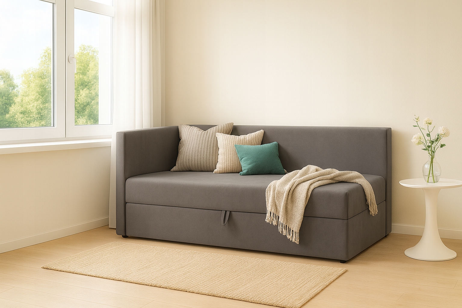 Модель имеет вместительное отделение для постельных принадлежностей, открывающееся с помощью обивочных машин, что облегчает подъем и повседневное использование.