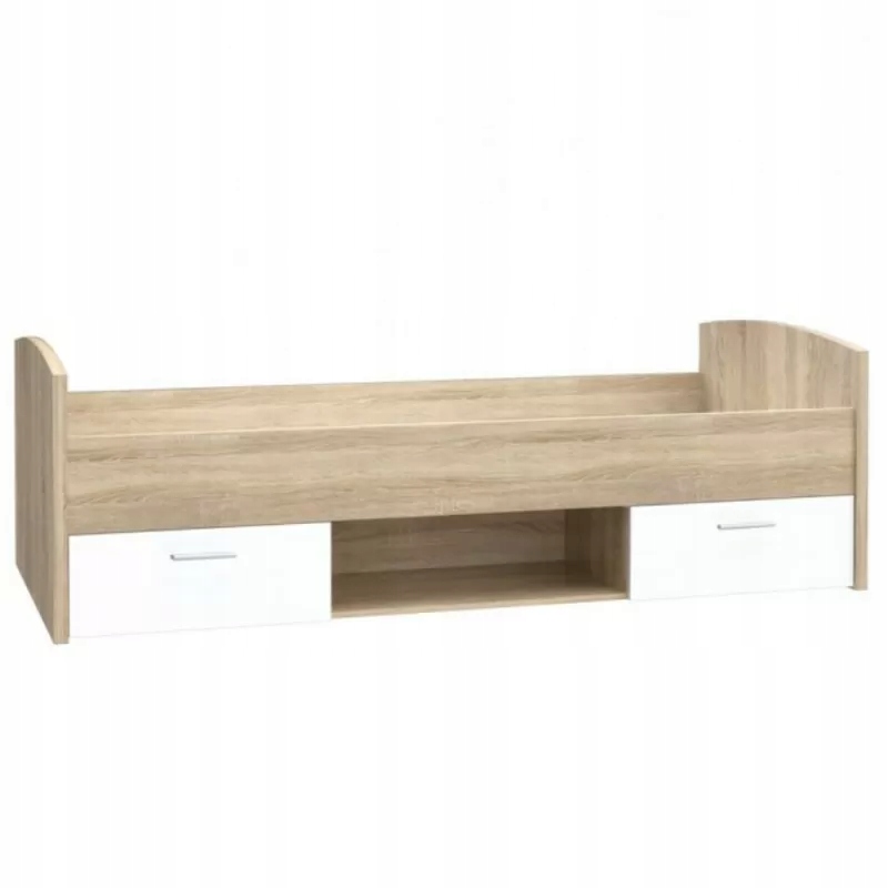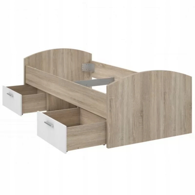 Мебель выполнена в стильном сочетании декора Дуб Сонома с белыми фасадами ящиков. Тип вкладыша: пружинный. Простые ручки изготовлены из пластика с эффектом алюминия. Благодаря ящикам на колесиках пользоваться ими будет удобнее и проще. Кровать, адаптированная к матрасу: 90 см х 200 см. Требуется вставка в раму NX20