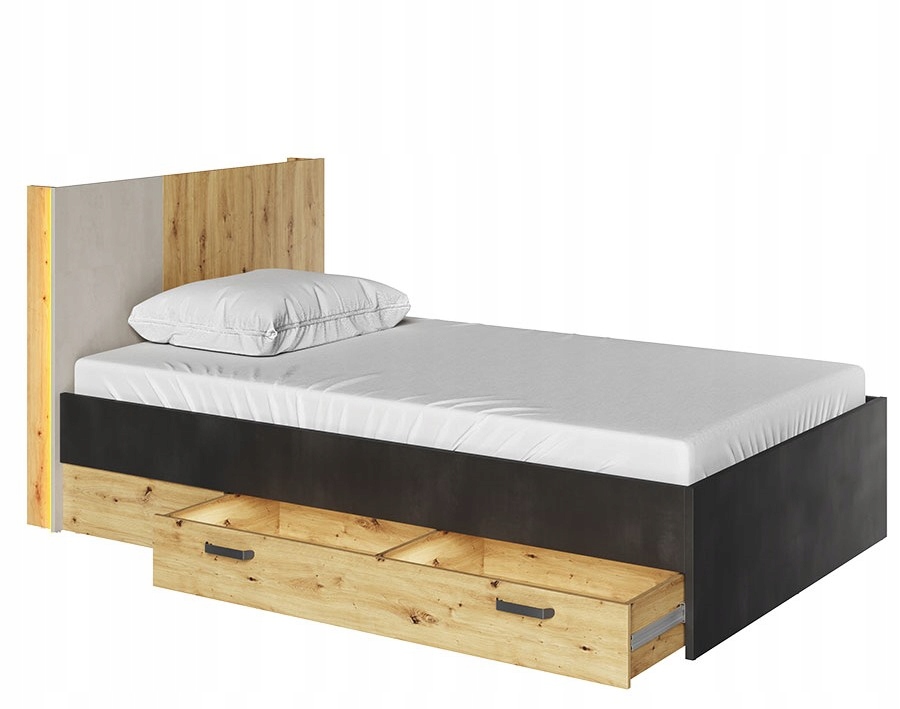 Имеет два широких ящика, в которые можно спрятать постельные принадлежности или дополнительные подушки; полка в подголовнике и желтая светодиодная подсветка с обеих сторон.