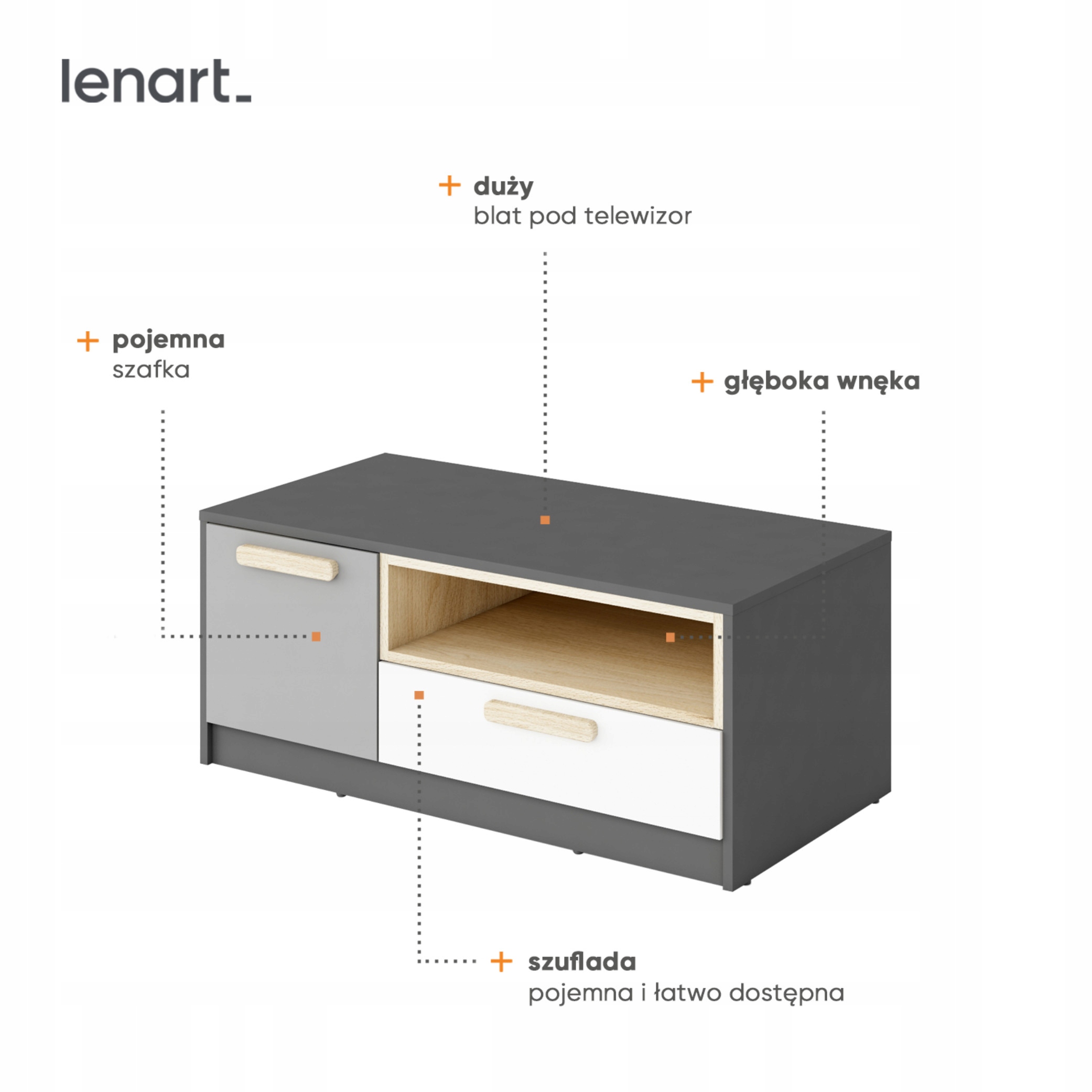 Функциональный шкаф оснащен вместительным выдвижным ящиком, дверцей и открытой, легкодоступной полкой для ТВ-аппаратуры.