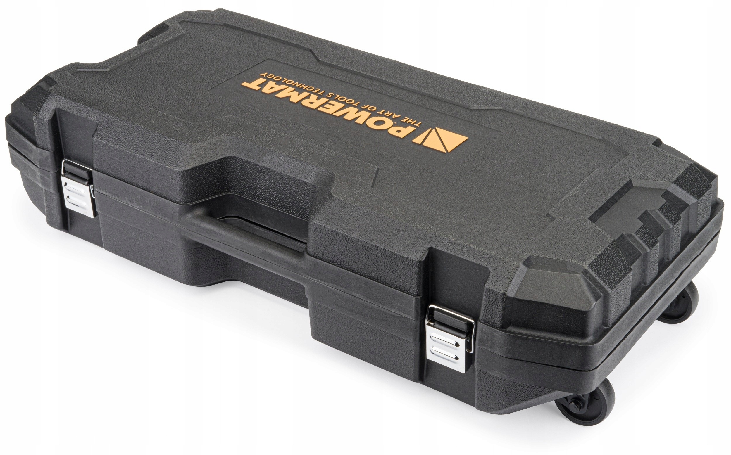 Благодаря очень прочному чемодану на колесах транспортировка всего набора значительно упрощается. Чемодан дополнительно оснащен двумя ручками (для горизонтального переноса чемодана и для вертикального перемещения чемодана по земле на колесах), что еще больше повышает его мобильность при транспортировке. Для лучшей защиты содержимого чемодан имеет две металлические застежки. Чемодан также служит органайзером для инструментов.