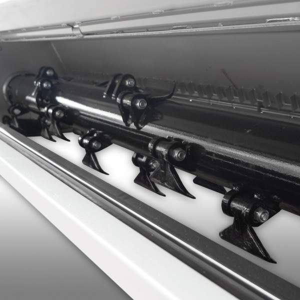 Задняя защитная крышка открывается, поэтому при скашивании высокой травы можно открыть крышку, чтобы что лишний материал сможет быстрее выйти из рабочей камеры. Это существенно снижает нагрузку на трактор и повышает эффективность работы. Однако материал, выпадающий из-под открытой створки, измельчается хуже и сохраняется дольше, чем если бы створка во время кошения была постоянно закрыта.