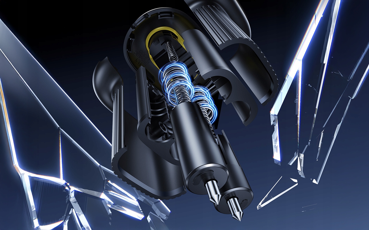 Кроме того, скрытый нож позволяет за несколько секунд перерезать ремни безопасности, обеспечив быстрый выход из автомобиля. Интуитивно понятная пружинная конструкция создает мгновенную силу удара, позволяя разбить стекло даже под водой. Эргономичная нескользящая ручка обеспечивает надежный захват даже в сложных условиях.