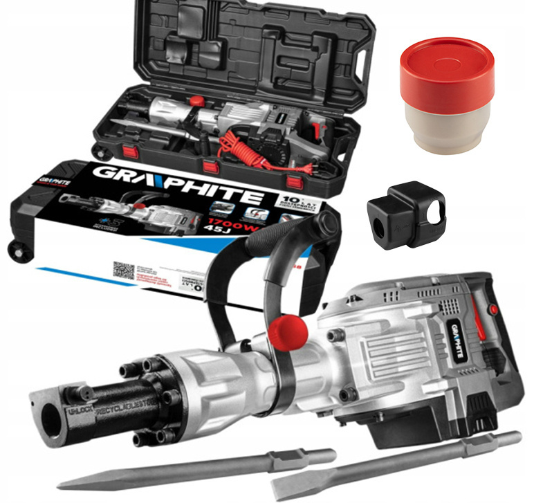 Молот для сноса, шестигранная ручка 30 мм, 1700 Вт, корпус 58G868 производства GRAPHITE Это инструмент с шестигранной ручкой диаметром 30 мм и мощностью 1700 Вт, предназначенный для работ по сносу и ремонту. Предлагается в прочном чемодане с принадлежностями - 1 долото, пылезащитный чехол, контейнер для жира. Молот характеризуется энергией удара 45 Дж и частотой ударов долота 1500 в минуту. Он имеет шнур питания длиной 4 м, а его общий вес составляет 14 кг. Это прочный инструмент с корпусом, устойчивым к механическим повреждениям и высоким температурам. Отбойный молоток с ручкой марки GRAPHITE рекомендуется профессионалам.
