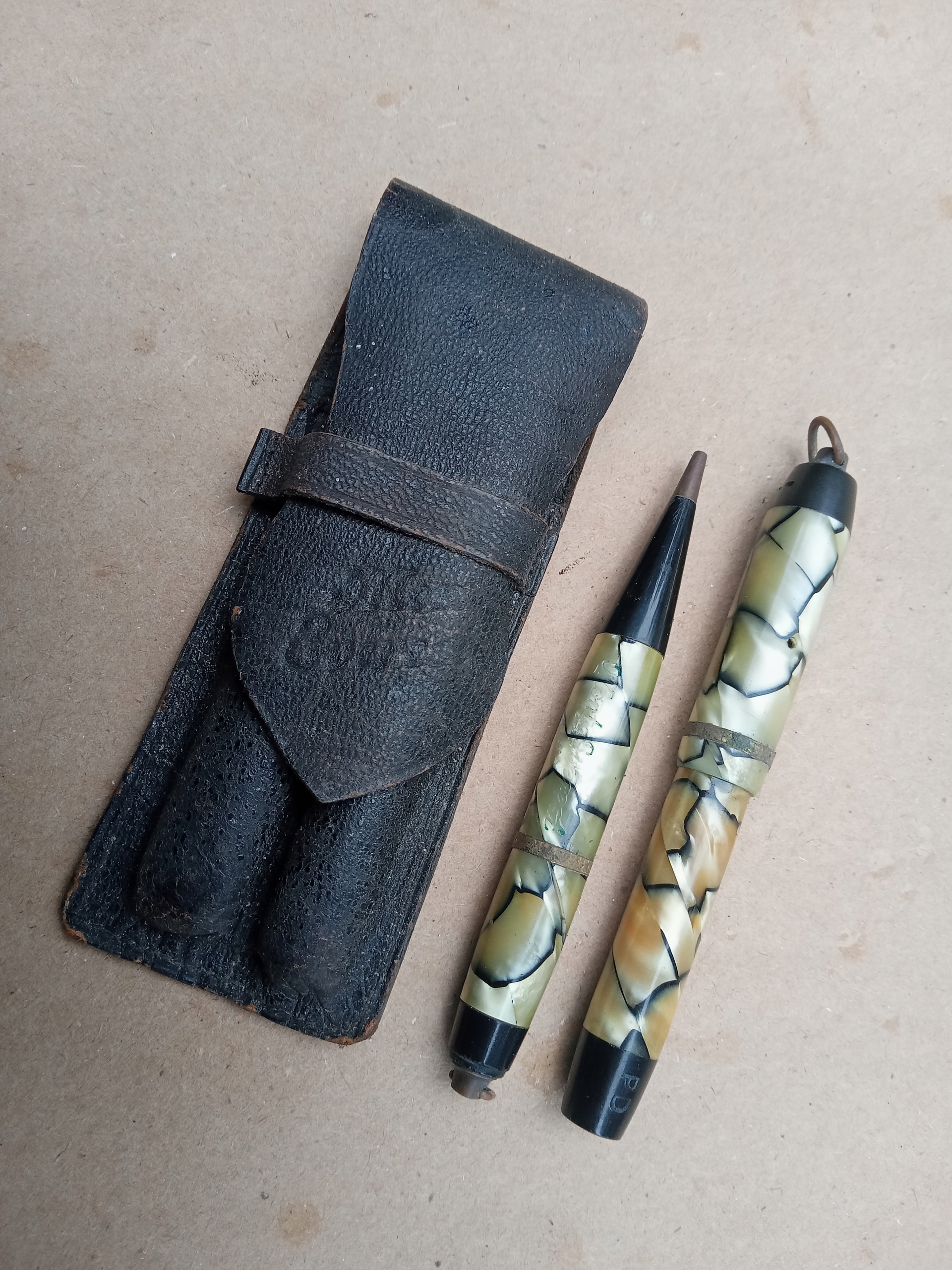 кожаный чехол имеет порванную полосу с одной стороны, на обложке надписи MONT EVEREST, карандаш и ручка, длина ручки 9 см, длина карандаша 9 см, на наконечнике надпись WARRANTED 14 Cb