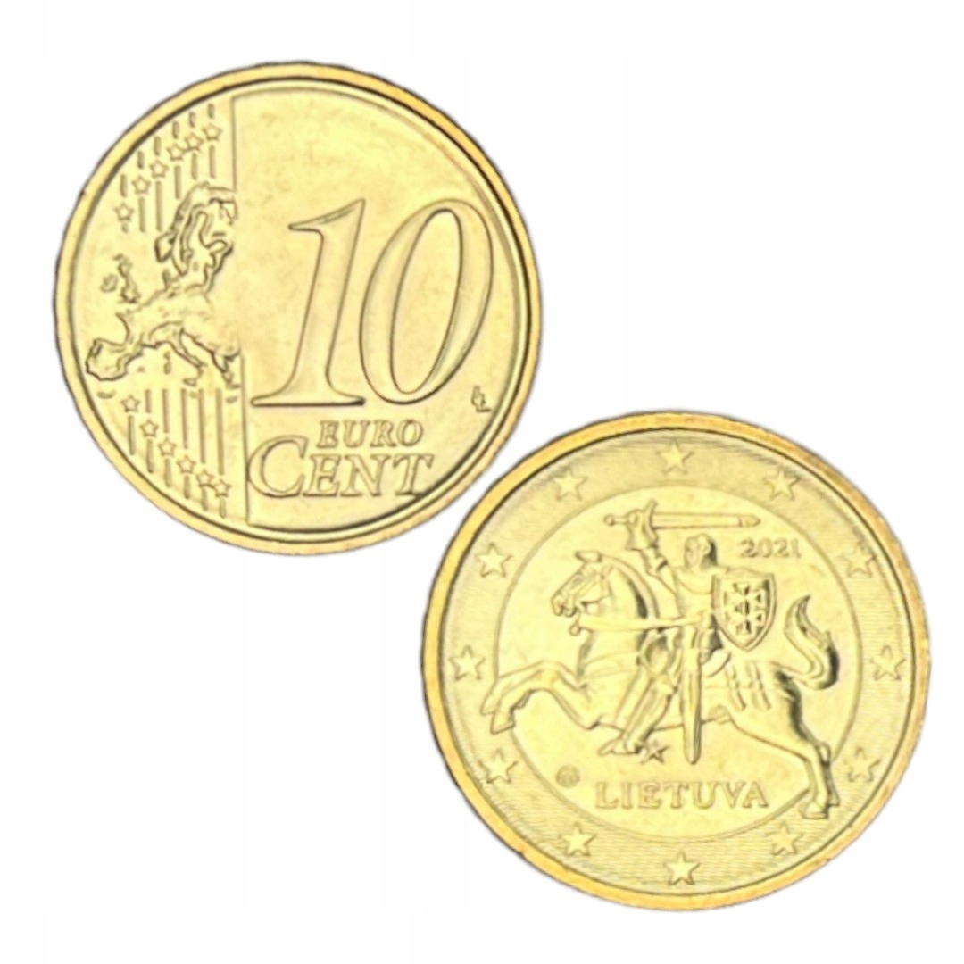 Обратительную монету зоны евро номинальной стоимостью 10 ЕВРОЦЕНТОВ из страны ЛИТВА с указанием года производства 2021.
