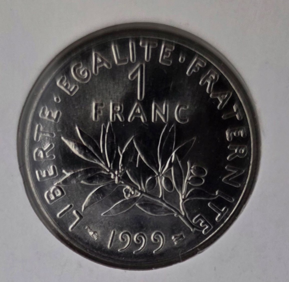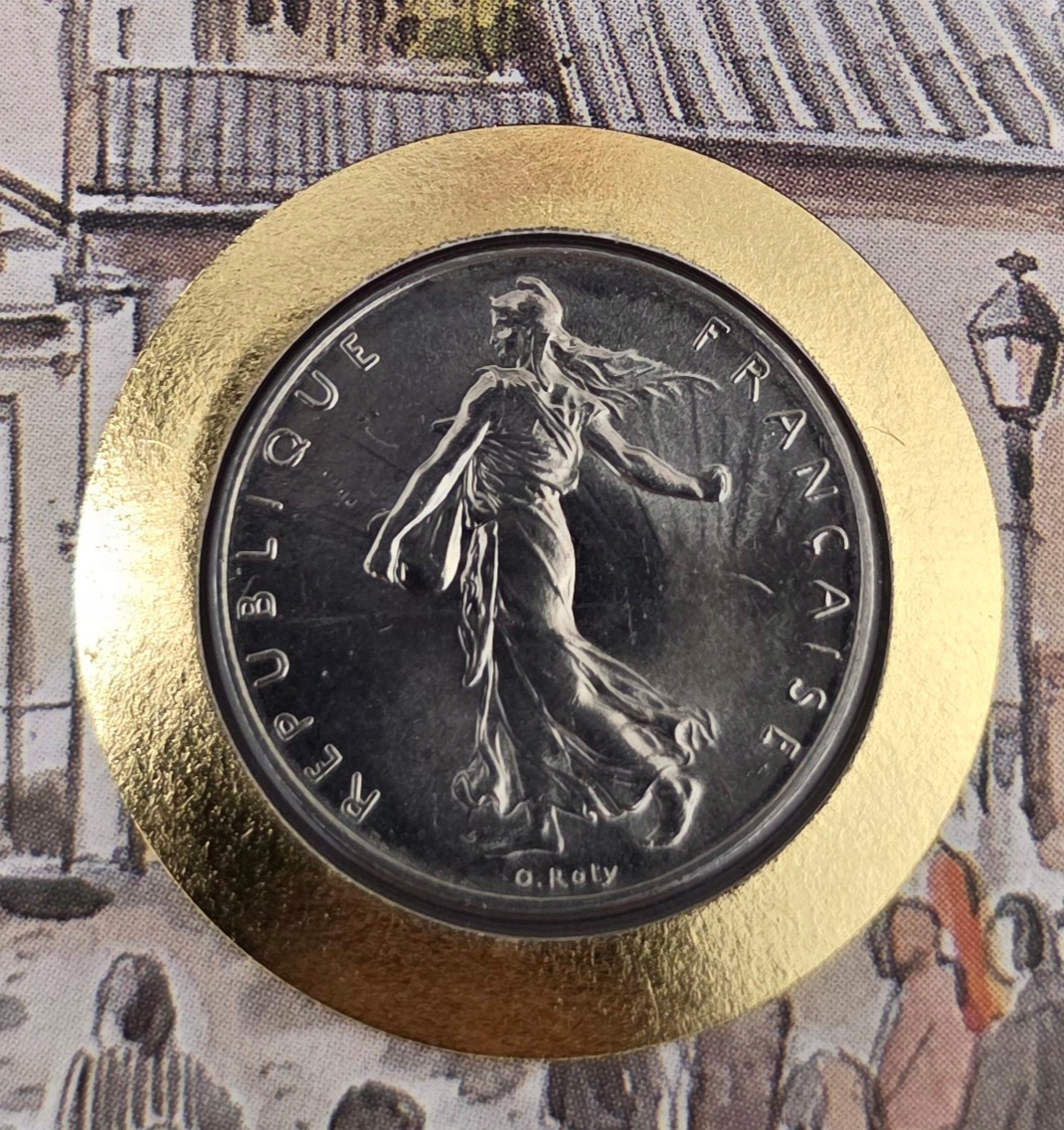 Франция 1 франк 1999 года (La Semeuse) в поздравительной открытке FDC Монета в оригинальной почтово-нумизматической папке (штемпель Парижа) M2