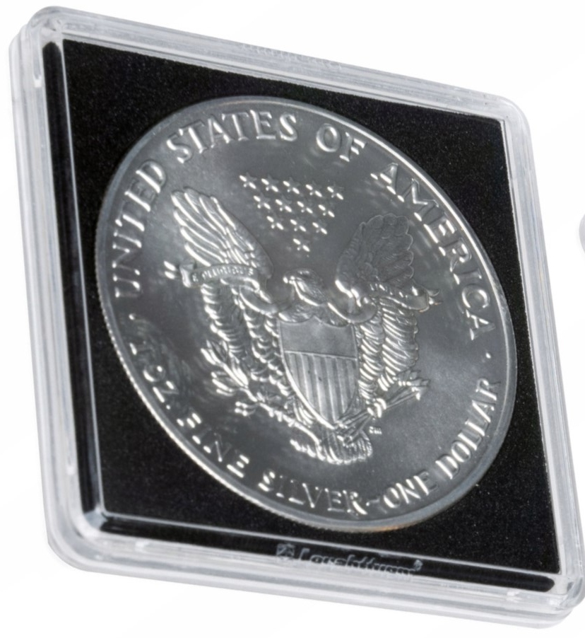 - Монеты упакованы в специальные квадратные приподнятые защитные колпачки Quadrum High от немецкой компании Leuchtturm. < /ул>
