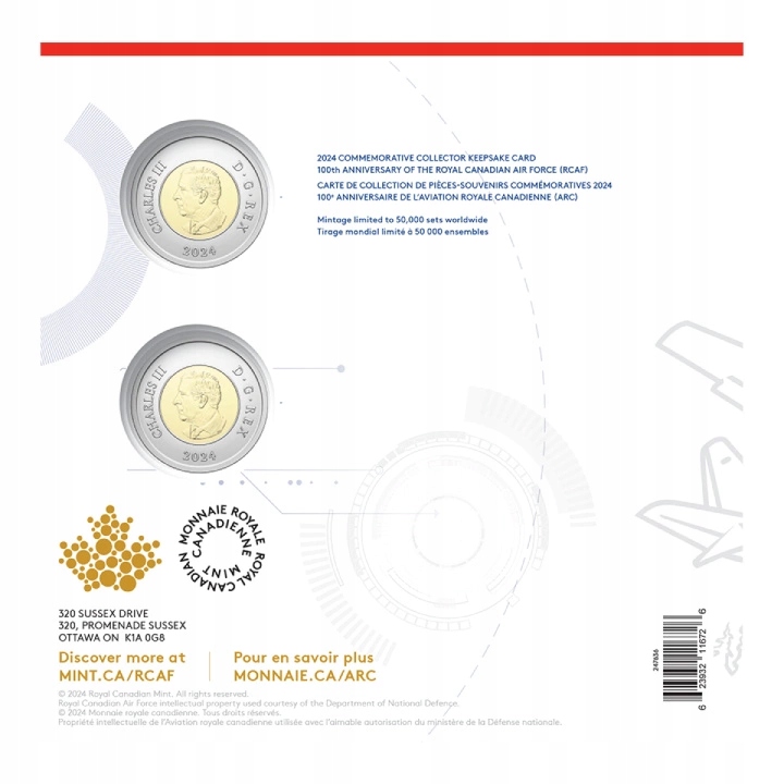 Канада: 100-летие Королевских ВВС Канады — памятная коллекционная сувенирная карта — набор из 2 монет 2024 года с гордостью отмечает 100-летие Королевских ВВС Канады. С момента своего создания в 1924 году Королевские военно-воздушные силы Канады (RCAF) превратились в выдающееся национальное учреждение, сыгравшее ключевую роль в истории Канады в небе.