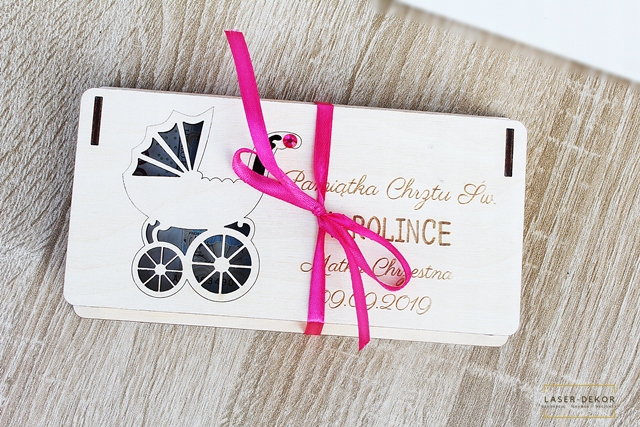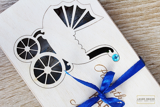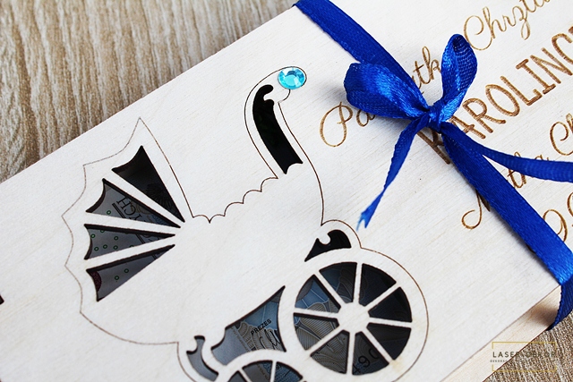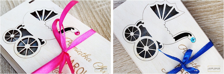 Шкатулка украшена розовым цирконом и перевязана розовой лентой - для девочки или синим цирконом и голубой лентой - для мальчика.