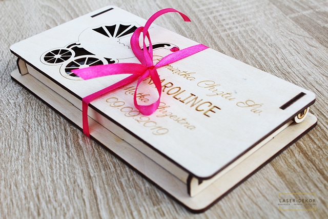 Внешняя сторона содержит данные ребенка (обычно имя + дата), также может быть заголовок по случаю, например, «Твой первый годик», а также короткие пожелания.