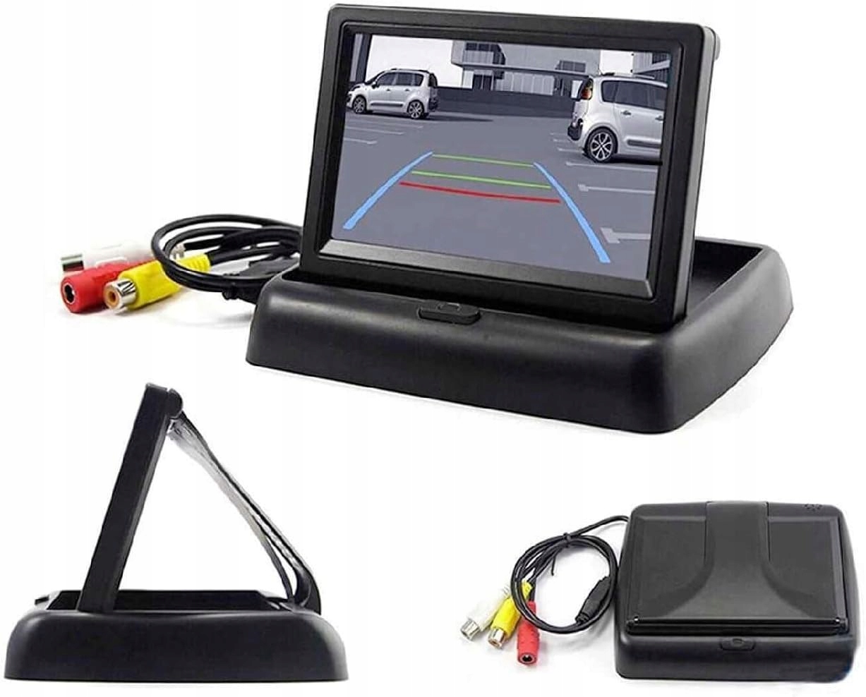 Складной монитор с диагональю экрана 4,3 дюйма предназначен для подключения камер заднего вида и других устройств с разъемом RCA «тюльпан». Монтажная база позволяет установить его в любой автомобиль на приборную панель.