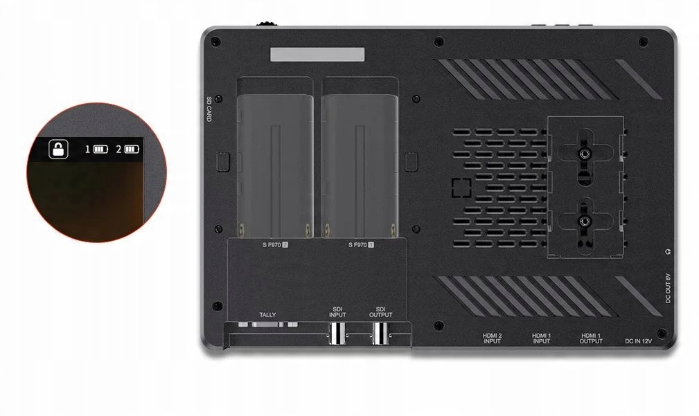 Монитор оснащен двумя гнездами для батарей NP-F , что позволяет вам продлить рабочее время: