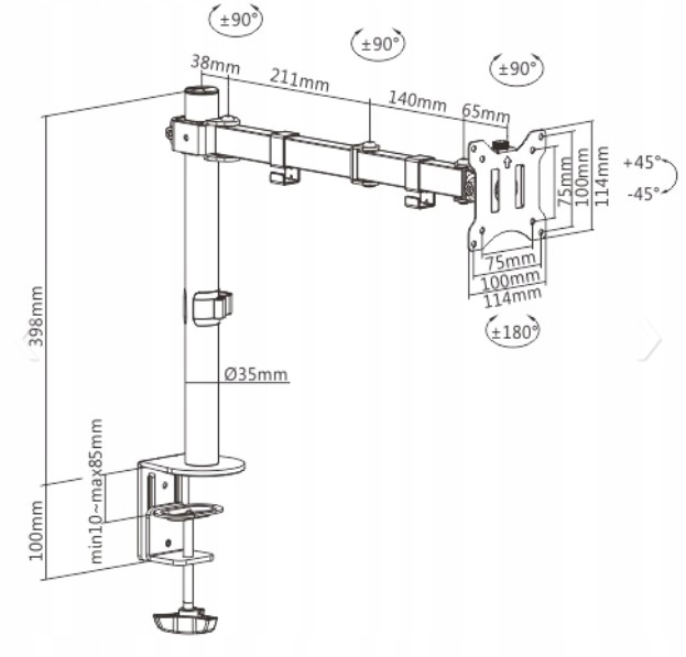 - поворот монитора на 180 градусов и наклон в диапазоне от -90 до +90 градусов и плавную регулировку высоты по вертикали
