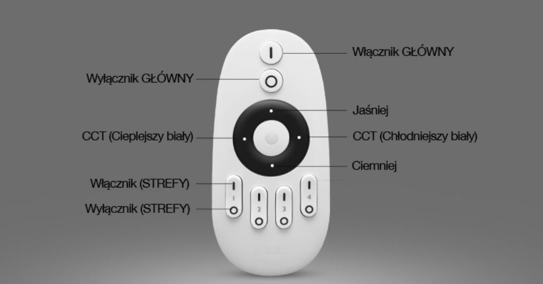 Пульт дистанционного управления позволяет плавно регулировать яркость и цветовую температуру белого света с помощью 4-позиционных кнопок. Пульт работает в 4-х зонной системе.