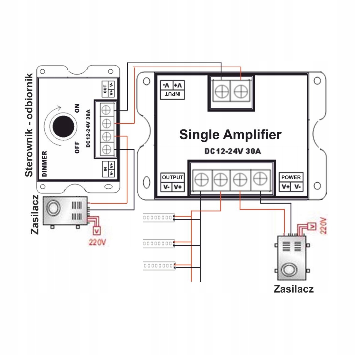 Усилители сигнала для одноцветных светодиодных лент применяются в том случае, когда общее потребление светодиодной ленты превышает максимальную выходную мощность данного диммера или светодиодного приемника. Устройство может работать с другими усилителями, благодаря этому набору мы можем создавать отрезки одноцветной ленты любой длины. Комплект будет управляться одним диммером или светодиодным приемником.
