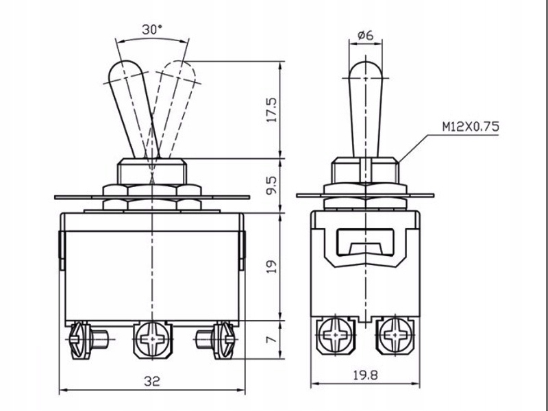 Переключатель рычажный КН3(Б)-223 трехпозиционный - ВКЛ-ВЫКЛ-ВКЛ, моностабильный (мгновенный).