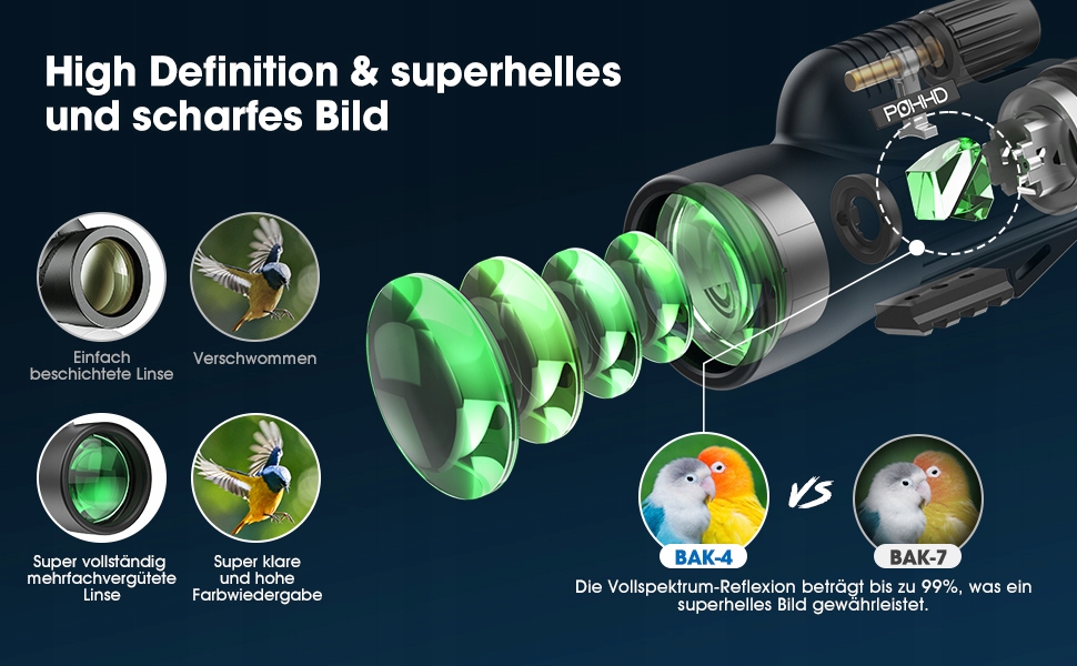Высококачественные призмы BAK4 обеспечивают большую светопроницаемость и более яркие изображения, чем традиционные призмы K7, а многослойное покрытие FMC обеспечивает более четкое изображение и более яркие цвета, чем однослойное покрытие. Высокопроизводительные бинокли POHHD обеспечивают более четкое изображение, высокую контрастность и высокое разрешение.