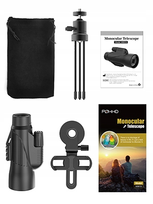 Монокуляр: 12 x 56 HD: 12-кратное увеличение и большой объектив диаметром 56 мм обеспечивают большее и четкое поле зрения. Высококачественная ручка фокусировки обеспечивает точную фокусировку, а откидной окуляр удобен для людей, носящих очки. Телескоп POHHD обеспечивает исключительно комфортное визуальное восприятие.