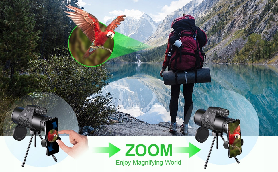 Наш монокулярный звездоскоп Поставляется с новейшим держателем для смартфона и быстроустанавливаемым штативом. Идеально подходит для iPhone, Samsung Galaxy, Sony и других смартфонов, представленных на рынке. Наслаждайтесь идеальным телескопическим монокуляром. Идеально подходит для охоты, скалолазания, наблюдения за птицами, изучения животного мира и ландшафта, концертов, спорта, походов, кемпинга и путешествий.