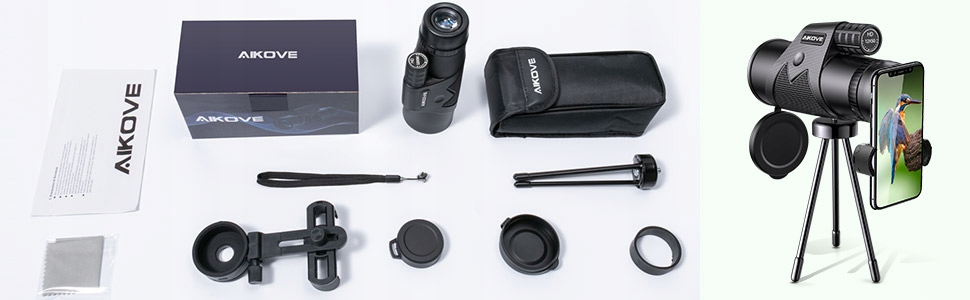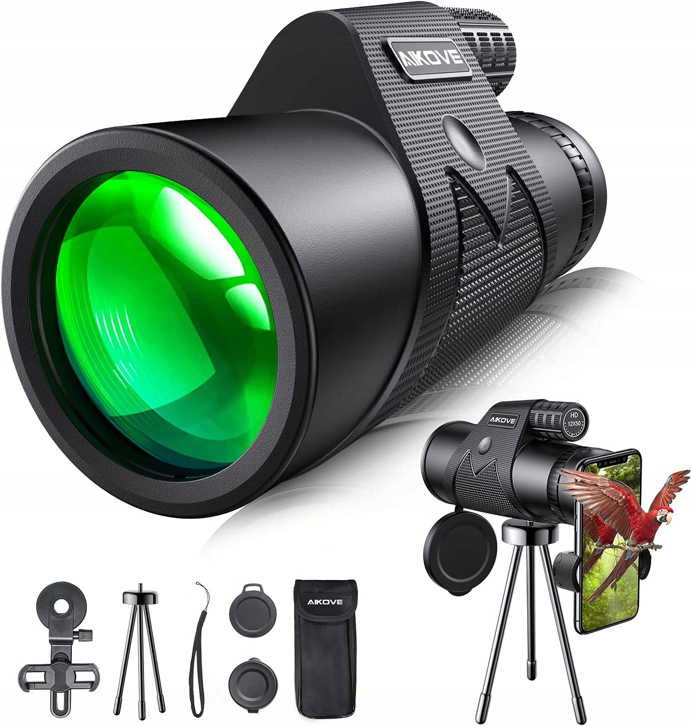 Монокулярный телескоп Aikove 12 x 50 Starscope Monocular HD Zoom Бинокль с держателем для смартфона и штативом, водонепроницаемый и запотевающий, монокуляр для наблюдения за птицами, кемпинга, путешествий, охоты, игр с мячом