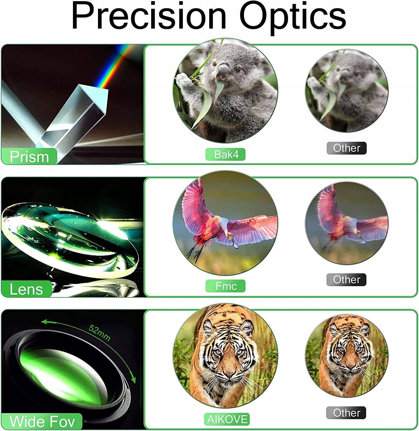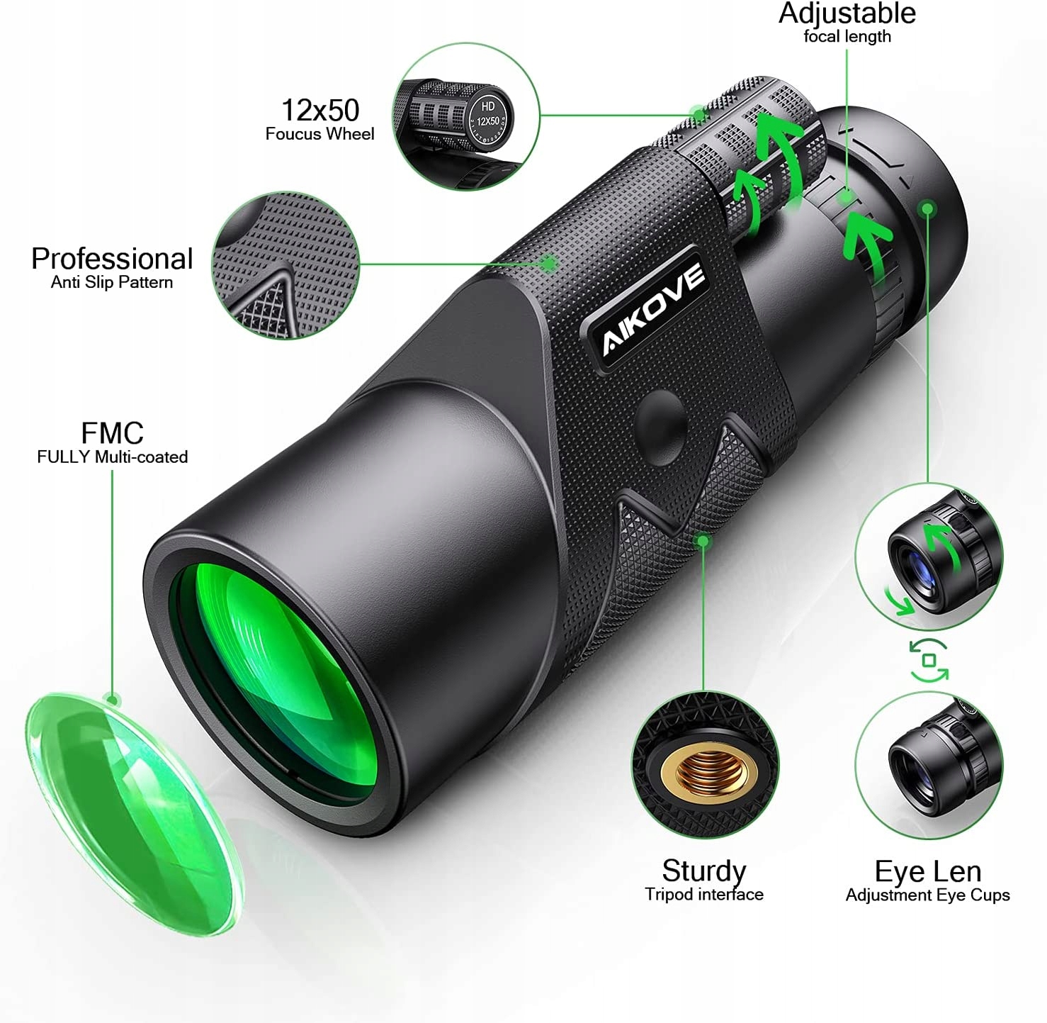 12 x 50 Монокуляр с зумом Высокопроизводительный монокуляр 12 x 50, 12-кратное увеличение и монокуляр с линзой 50 мм обеспечивают более четкое и яркое изображение. Многослойное покрытие линз BAK4 FMC улучшает ключевые функции монокуляра, обеспечивает хорошую светопроницаемость и яркость, делает видимость более четкой.