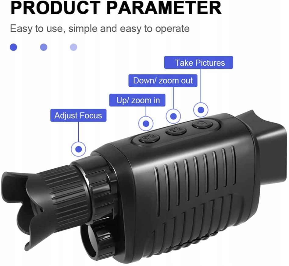 - Благодаря встроенной цифровой камере и 4-кратному зуму цифровой монокуляр ночного видения может записывать видео высокого разрешения 1088 x 1088/30 кадров в секунду. и делайте четкие фотографии.