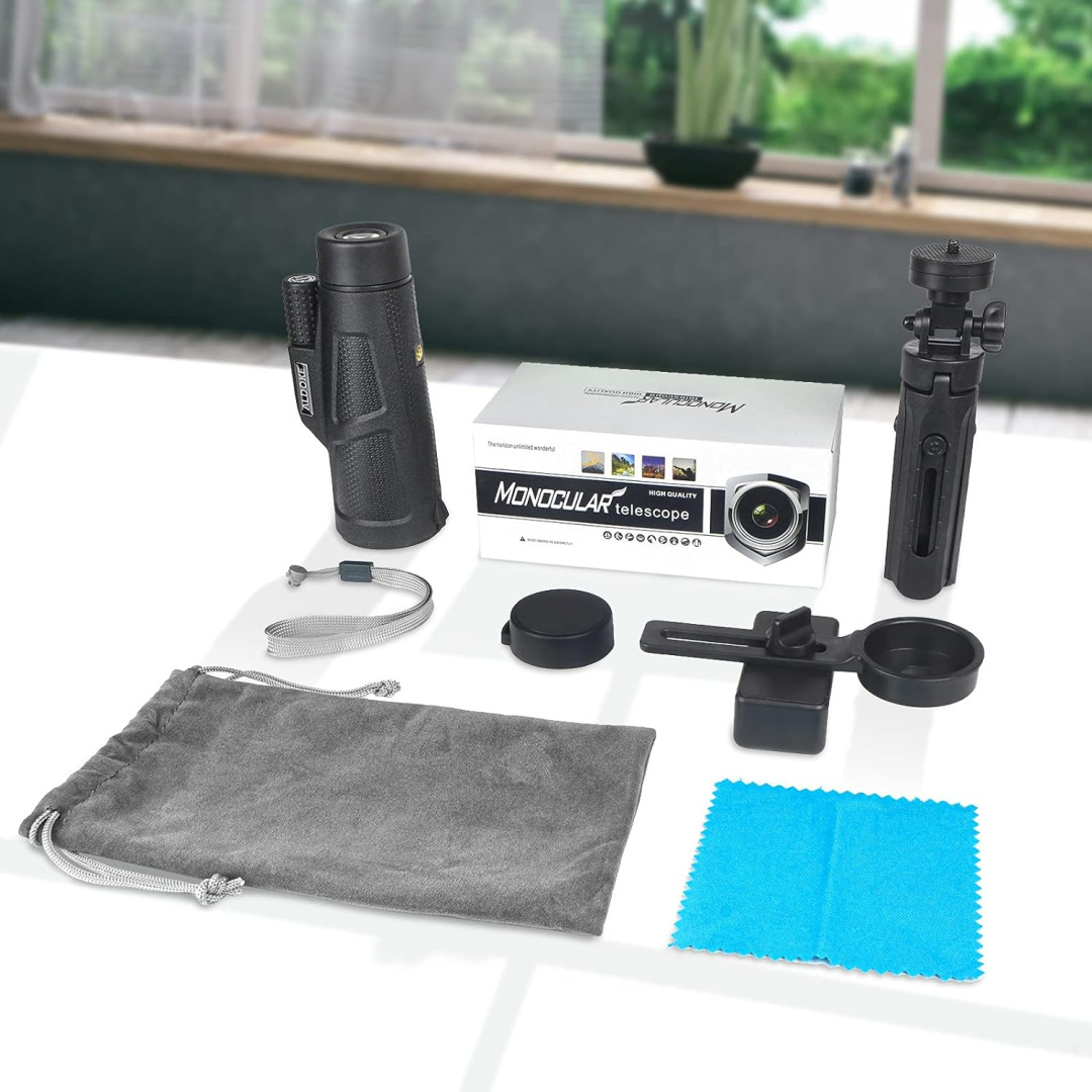 Профессиональный штатив и держатель для смартфона: Высококачественный штатив, благодаря которому монокулярный телескоп может вращаться на 360° без воздействия вибраций (30 передач, по 12° на каждую передачу), диапазон вертикального вращения составляет 180°, что облегчает регулировку положения объектива. 5 регулируемых и выдвижных длин делают штатив очень устойчивым. Входящий в комплект держатель для смартфона с диагональю 3,5–6,5 дюйма в сочетании со штативом позволяет делать очень хорошие и четкие снимки.