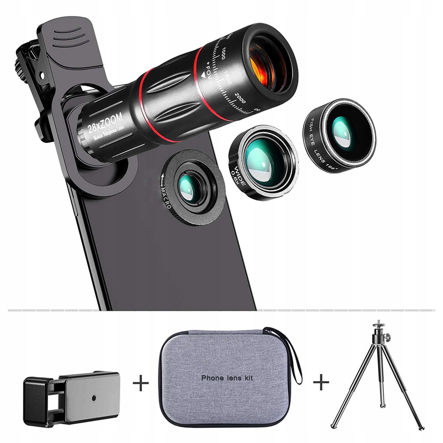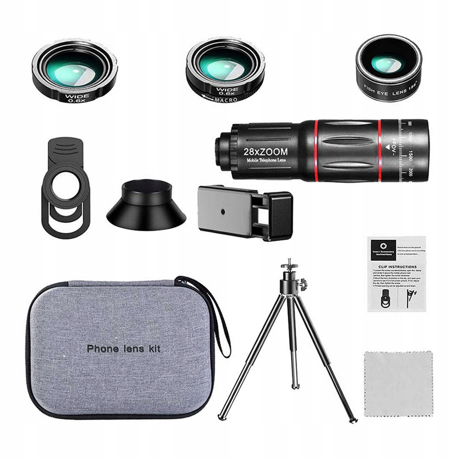 - Содержание Набор: монокулярная 28 -кратная линза, макро 2IN1, объектив, линза с рыбой, штатив, ручка e -type, универсальный клип, ткань, элегантная крышка