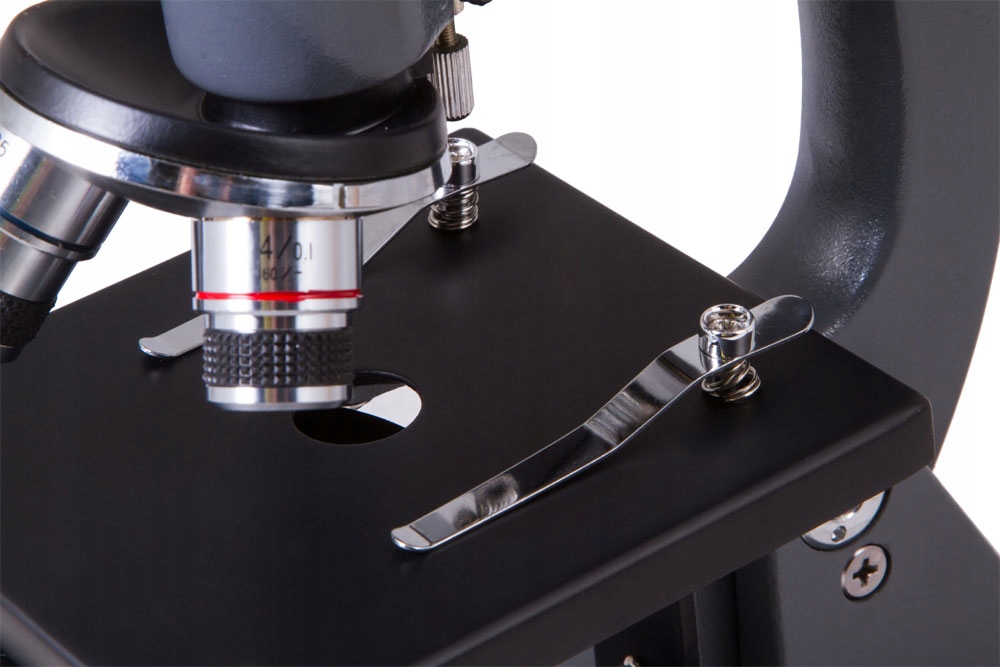 Микроскоп монтируется вращающейся треугольной головкой, которая обеспечивает быстрое изменение линз линзы во время наблюдения. В трубке можно установить три разных очка - два из них включены в набор. Стол оснащен простыми зажимами, предназначенными для легкого размещения подготовленных приготовлений. Чуть над ним есть утолщающие и точные ручки фокусировки, которые обеспечивают плавную фокусировку. Источник света - это небольшое зеркало. Роторная диафрагма позволяет регулировать интенсивность освещения.