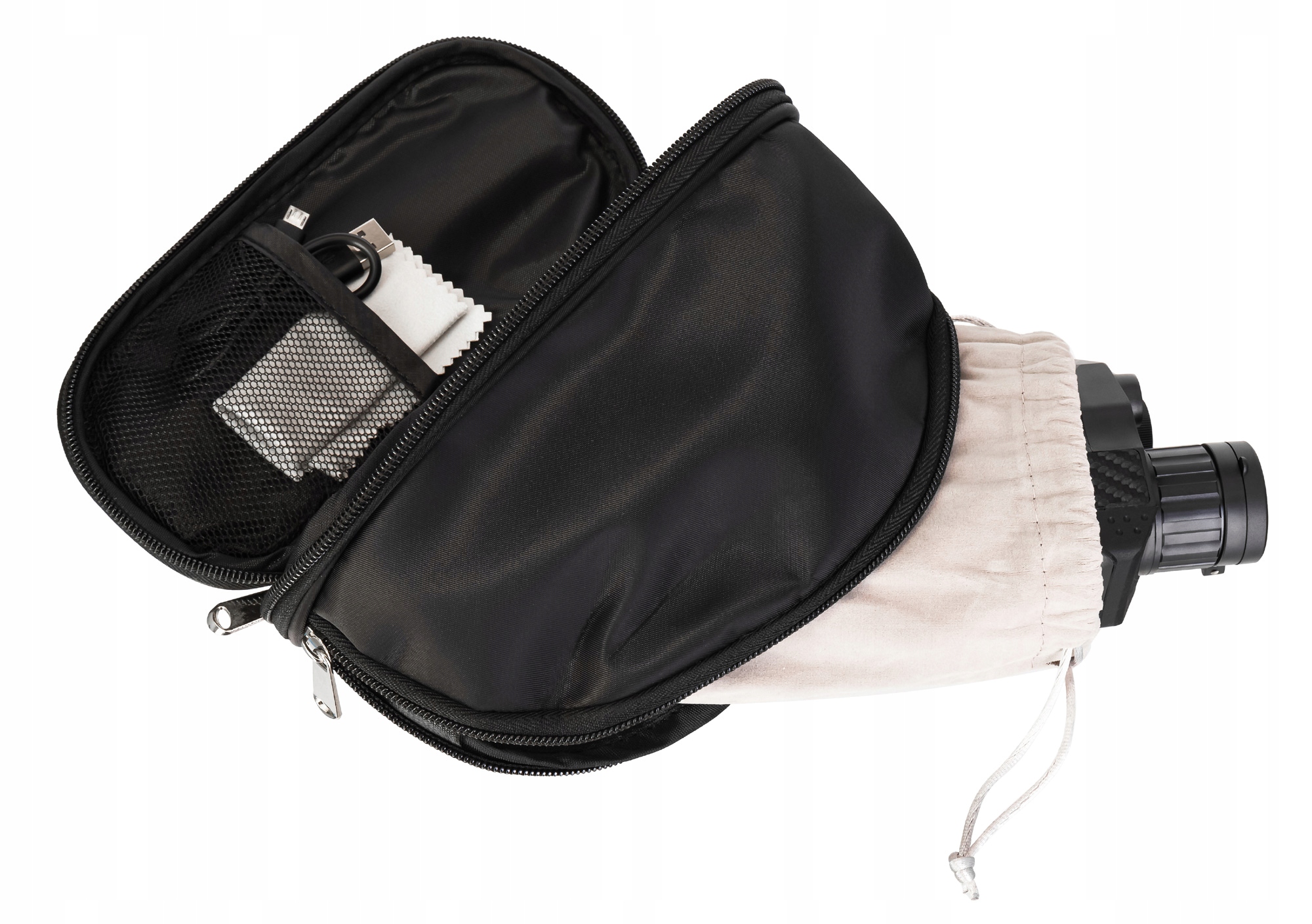 Монокулярное тело легкого изготовления из пластика ABS, которое известно своим сопротивлением механическим нагрузкам. Устройство удобно в руке и не занимает много места во время транспорта. Монокуляр питается от заменяемой батареи, а рабочее время на одном заряде составляет до 5 часов (с инфракрасным освещением). Автоматическая функция дисплея дисплея и устройство значительно экономит батарею.