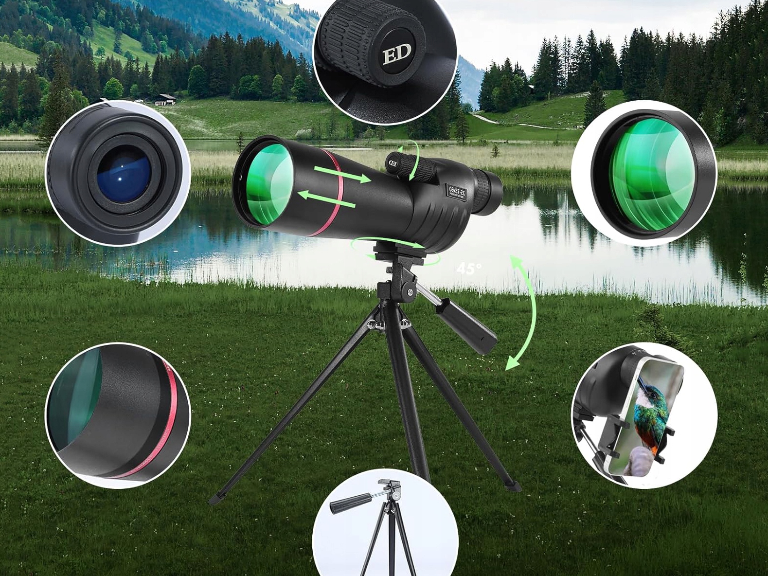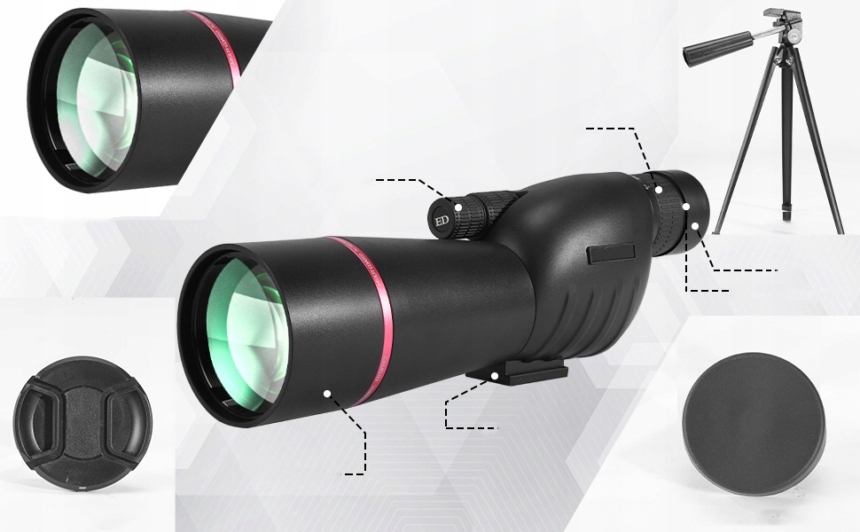 Этот телескоп ED идеально подходит для стрельбы по цели, наблюдения за птицами, охотой, стрельбой из лука, блуждания, ландшафтами, путешествиям и другими мероприятиями на свежем воздухе.
