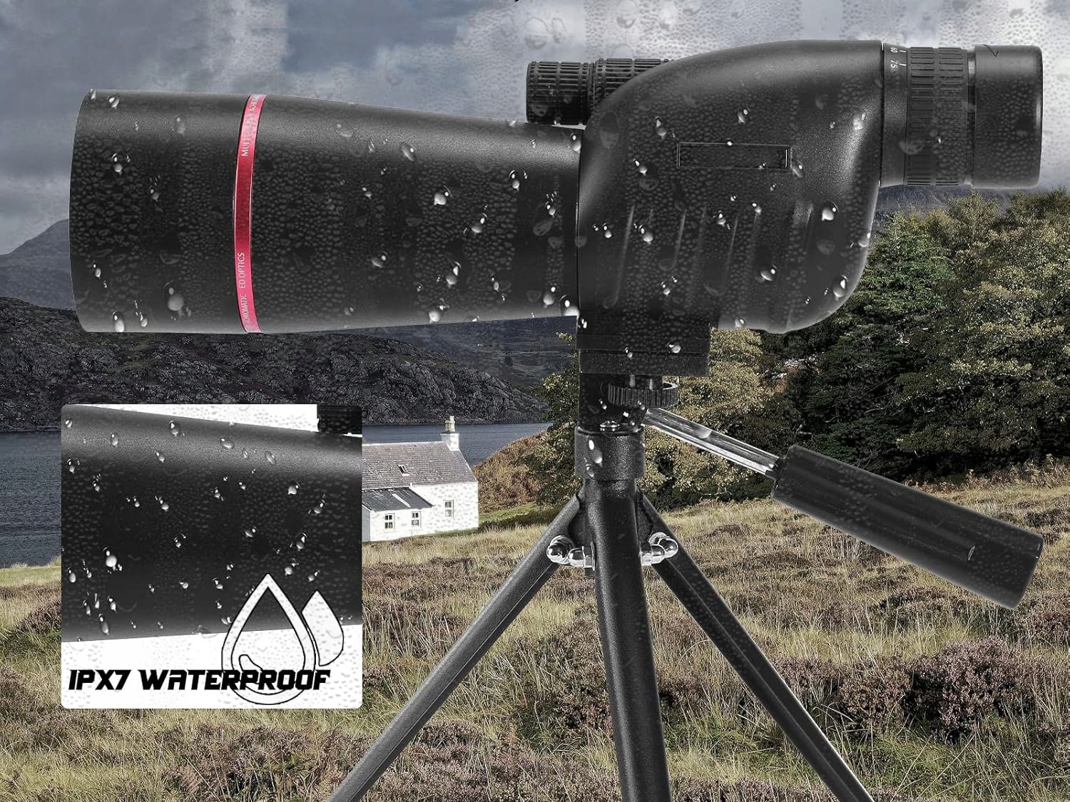 Водонепроницаемый телескоп изготовлен из водонепроницаемого материала и заполнен азотом, благодаря которому его можно использовать в любых погодных условиях.