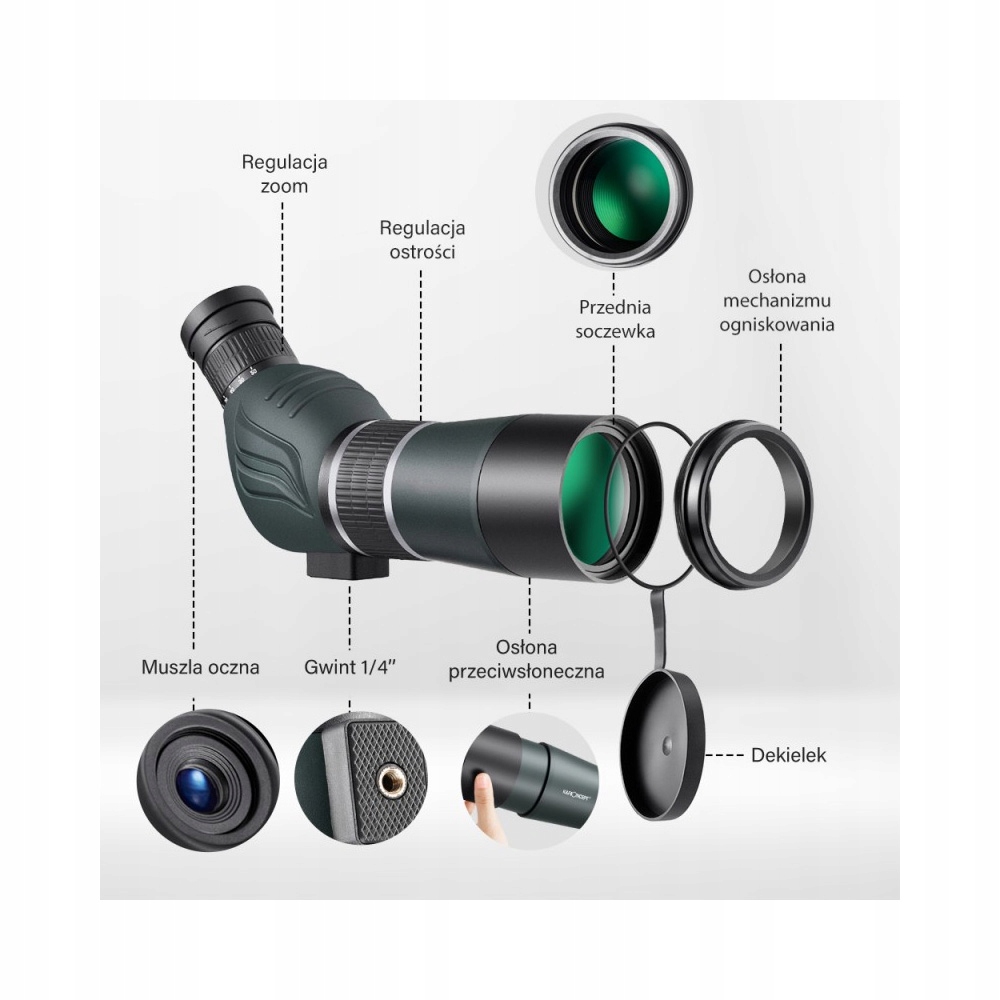 Телескоп имеет эргономичную форму, что обеспечивает комфортное наблюдение. Окуляр диаметром 15 мм имеет резиновую выдвижную крышку, которая позволяет приблизить его к глазу и ограничить попадание бокового света. Чуть ниже окуляра находится кольцо управления масштабированием. На основной трубке имеется кольцо, отвечающее за настройку фокуса. Оба кольца имеют небольшое сопротивление, что позволяет нам точно подобрать нужные значения. Внутренняя система фокусировки предотвращает выход передней линзы за пределы тубуса, эффективно защищая ее от царапин. При работе при ярком солнечном свете мы также можем использовать выдвижной солнцезащитный козырек.
