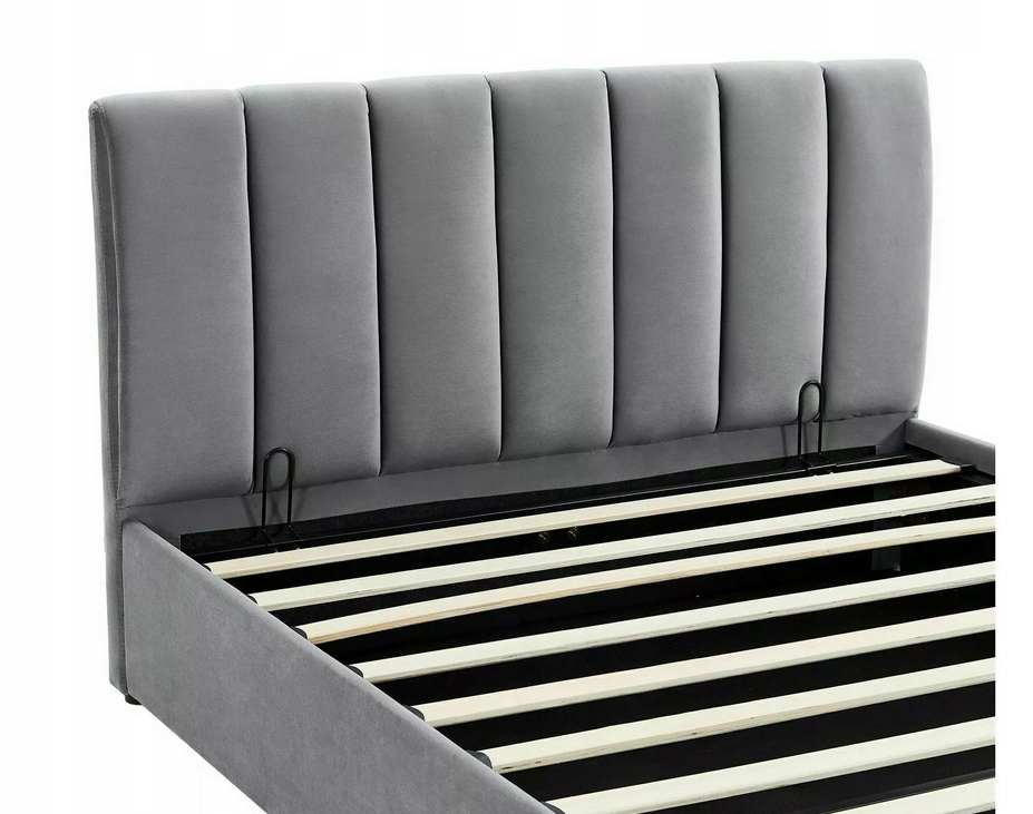Монреальский бархатный кровать является необходимым предметом мебели в каждой современной спальне. Кровать имеет практический контейнер для постельных принадлежностей. Это открывается, поднимая рамку. Это решение позволяет сохранить заказ в спальне и удобное хранение необходимого текстиля. Обитый слой является высококачественным материалом, устойчивым к повреждениям и грязи, в то же время очень приятно на ощупь. У этого есть удобный подголовник с модной вертикальной строчкой. Серый цвет очень практичен и до сих пор доминирует в тенденциях дизайна интерьера.