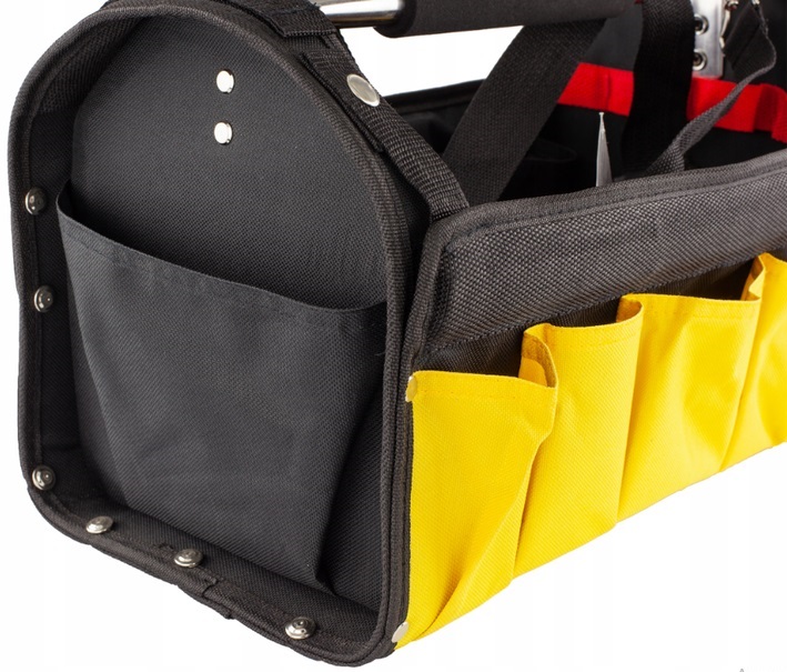 Большое количество карманов внутри и снаружи мешков облегчает организацию инструментов в соответствии с индивидуальными потребностями. Карманы имеют разные размеры, поэтому они обеспечивают хорошее соответствие для различных размеров инструментов. Металлическая ручка, частично покрытая пеной, позволяет удобному и быстрому перемещению пакета сборки на рабочем месте. Кроме того, сумка оснащена длинным и твердым регулируемым ремнем, который помогает комфортно перенести его на более длительное расстояние. Ремешок подключен к ручке металлическим карабинером, что позволяет легко и быстро отрешить. Закрепленное дно позволяет перемещать тяжелые объекты