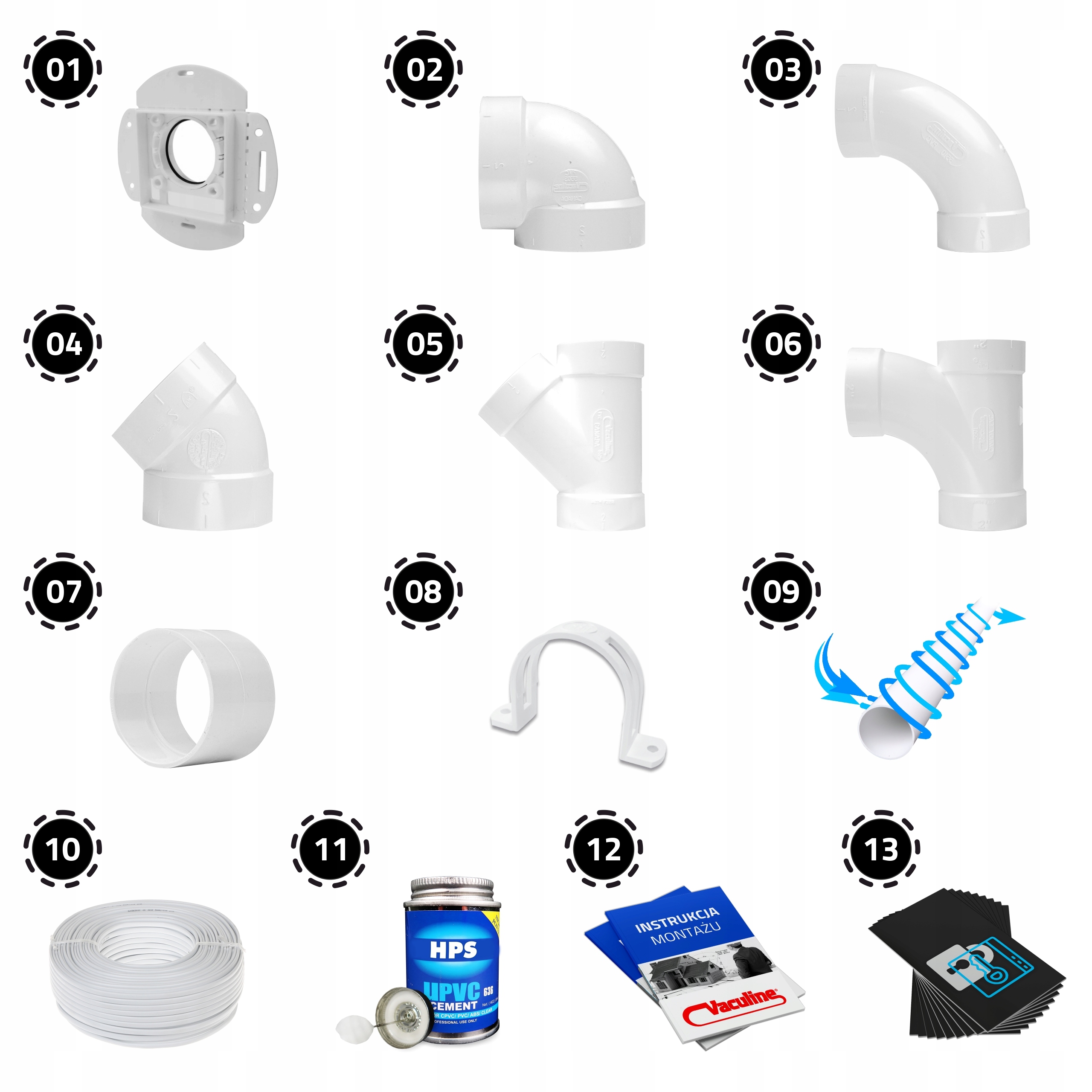 Комплект предназначен для самостоятельной сборки центральной пылесосной установки, состоящей из фитинги и трубы высочайшего качества от мирового производителяVACULINE® и PLASTIFLEX.