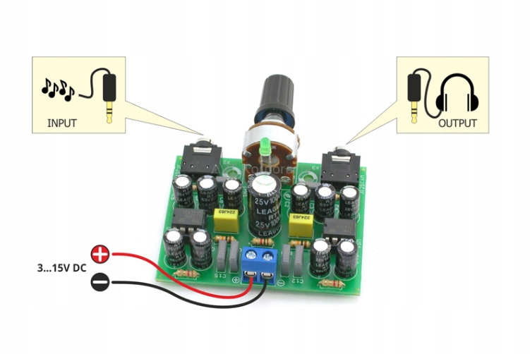 Двухканальный усилитель мощности создан на базе усилителей TDA7233. Для правильной работы требуется минимальное количество элементов, что делает этот проект очень простым. Подключите наушники с сопротивлением более 2 Ом к выходному стереоразъему мини-разъема. Наилучшие результаты достигаются с наушниками с сопротивлением 32Ом.