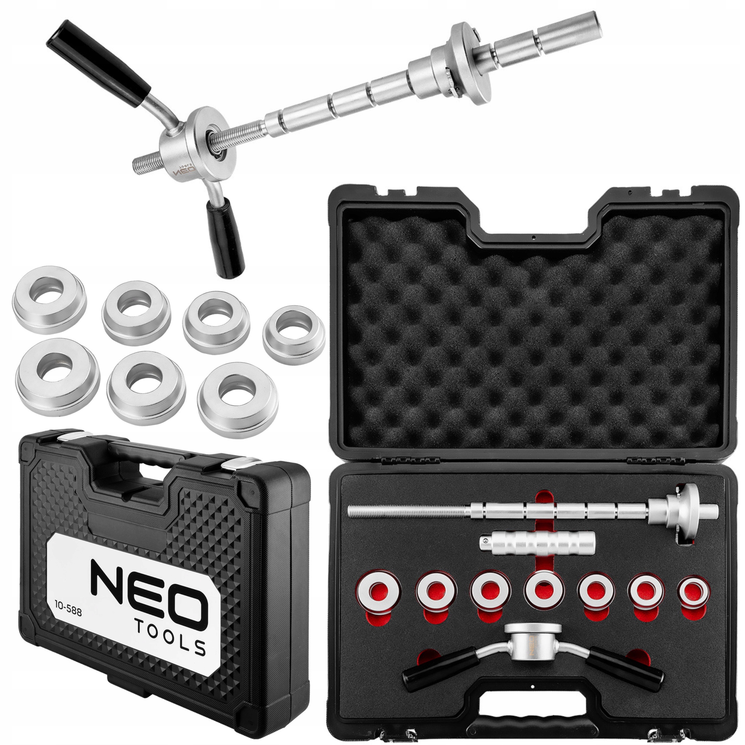 Набор инструментов для монтажа и демонтажа подшипников рулевой трубы мотоциклов 10-588 NEO представляет собой практичный набор элементов, позволяющий осуществить простую сборку, не опасаясь повредить подшипники или балку оси. Совместим с большинством подшипников. В комплект входят, среди прочего: прочные стальные кольца. 7 адаптеров подшипников имеют диаметр от 32 до 46 мм. В комплект также входит прочная направляющая и ручка типа Т. Весь комплект предлагается в практичном чемоданчике с тиснением, обеспечивающим порядок и удобство использования. Набор инструментов NEO рекомендуется для сложных задач.