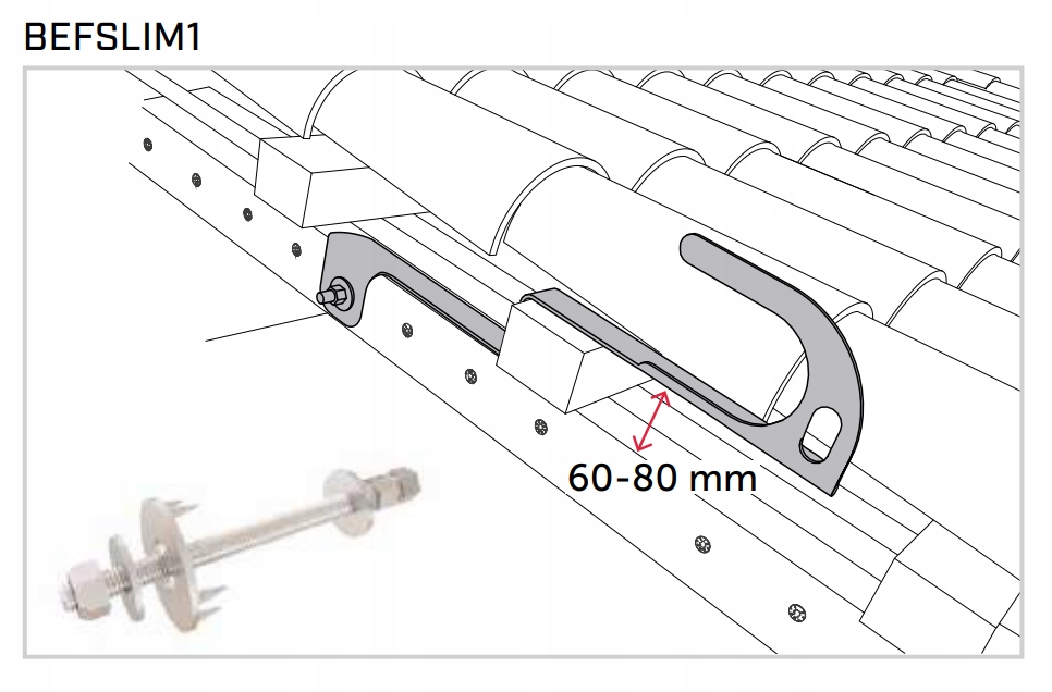 Установочный комплект Rothoblaas Slim BEFSLIM1 позволяет закрепить точку крепления к конструкции крыши с высотой обрешетки от 60 до 80 мм (для большей высоты используйте BEFSLIM2 80-140 мм).