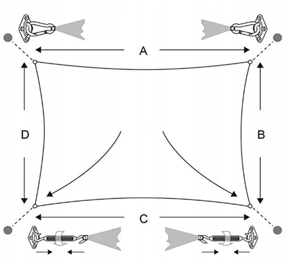 Наш комплект подходит для установки большинства типов теневых парусов, таких как треугольные, прямоугольные и выдвижные паруса.