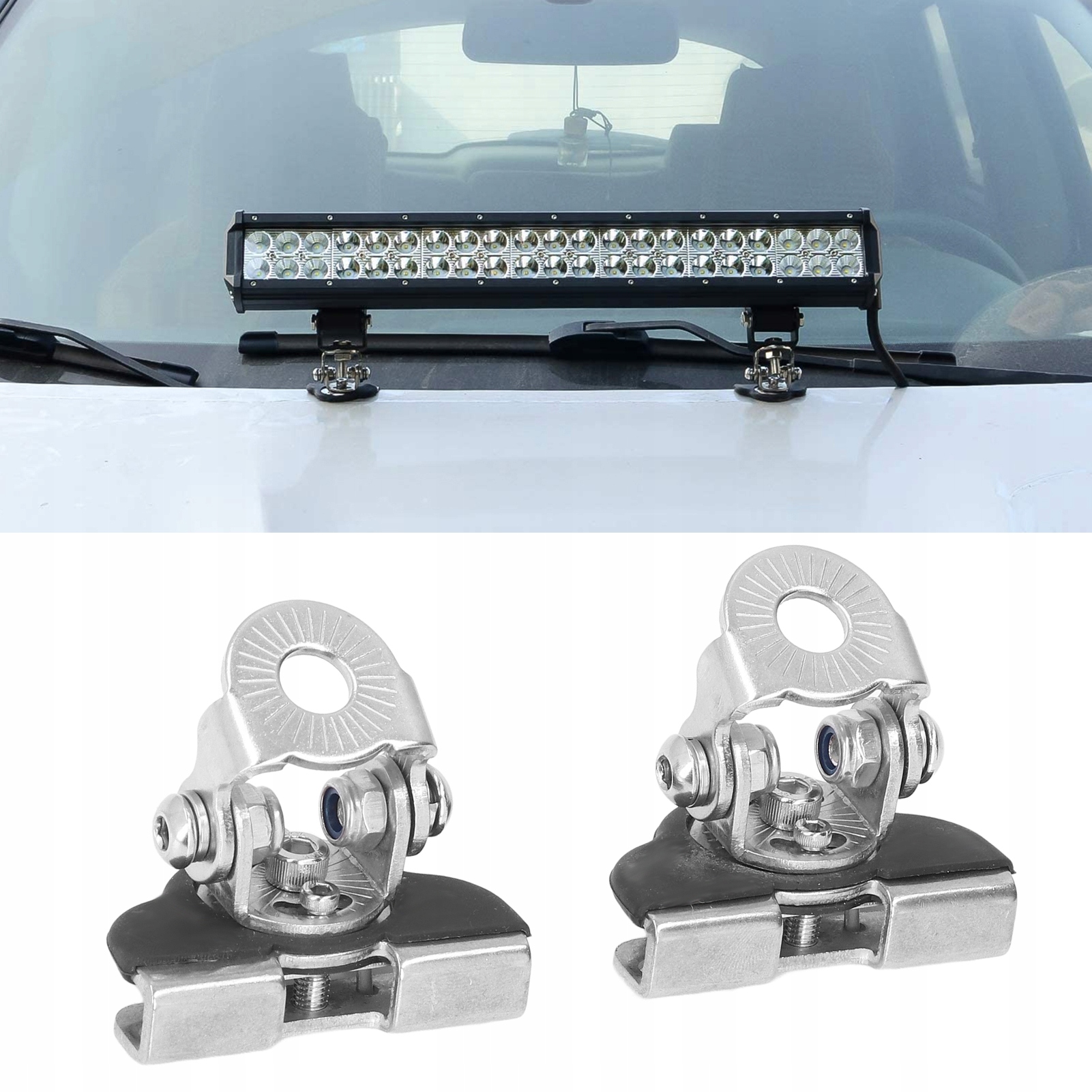 1. Высокая совместимость: монтажный кронштейн можно использовать для крепления рабочих фар, противотуманных фар, фар дальнего света и т. д. различной толщины. Толщина зажимной пластины в автомобиле ограничена максимум 8 мм/0,31 дюйма. 2. Не нужно сверлить: не нужно сверлить, просто закрепите монтажный комплект светодиодной планки на крышке и затяните его, он прост в эксплуатации. 3. Противоскользящая конструкция: набор зажимов оснащен нескользящими зубцами и резиновыми подушечками, которые обеспечивают надежную установку и не оставляют царапин на поверхности капота. 4. Свободная регулировка: вы можете свободно регулировать угол вверх и вниз на 180°, влево и вправо на 60°, чтобы гарантировать, что свет направлен в правильном направлении и под идеальным углом освещения. 5. Прочный материал: изготовлен из прочной нержавеющей стали 304, которая хорошо защищает и предотвращает ржавчину в плохую погоду.