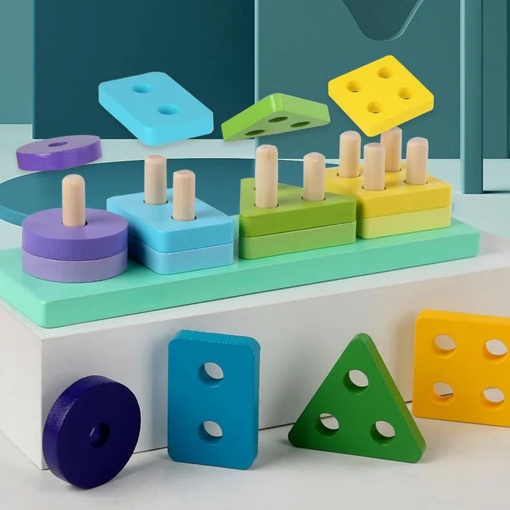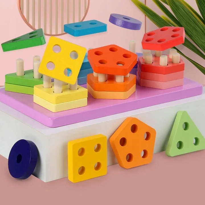 - Эта деревянная головоломка для сортировки и укладки состоит из 21 элемента, включая блоки с 5 геометрическими формами. Дети могут развить способность дифференцировать форму, цвет и размер с раннего возраста, пытаясь соответствовать блокам или создать различные комбинации.