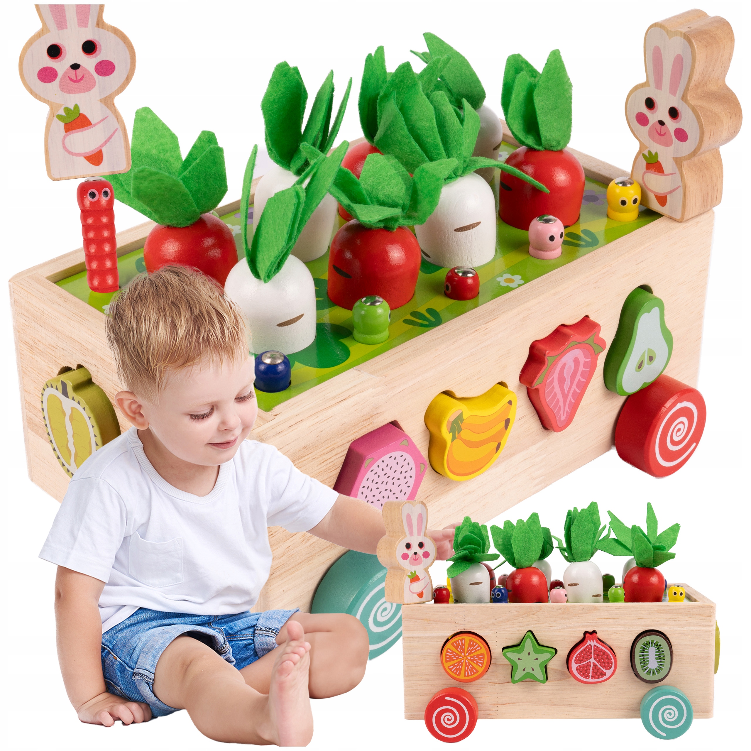 - Содержание : коляска, морковь и фруктовые блоки, деревянные кролики, черви